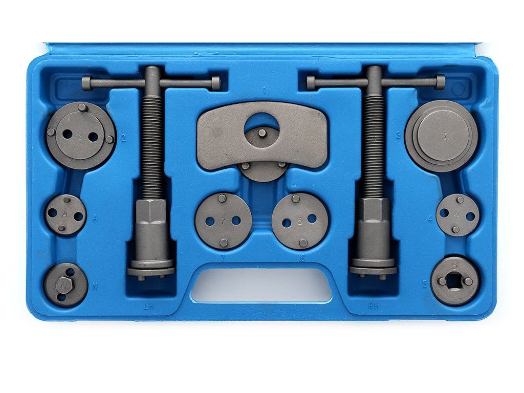 У комплект входять два преси (правий і лівий торсійні), дві балки для притиску преса до сідла затискача і широкий вибір перехідників. Точна підгонка перехідника і поршня є запорукою правильного введення поршня в циліндр гальмівного супорта. Це, в свою чергу, захищає механіку від заклинювання і заїдання поршня в циліндрі. Ручка оснащена магнітним наконечником, завдяки якому утримує на осі пластину, відповідну даному поршню. Набір рекомендований для загальномеханічних автосервісів, відмінно працює при роботі з керамічними поршнями.