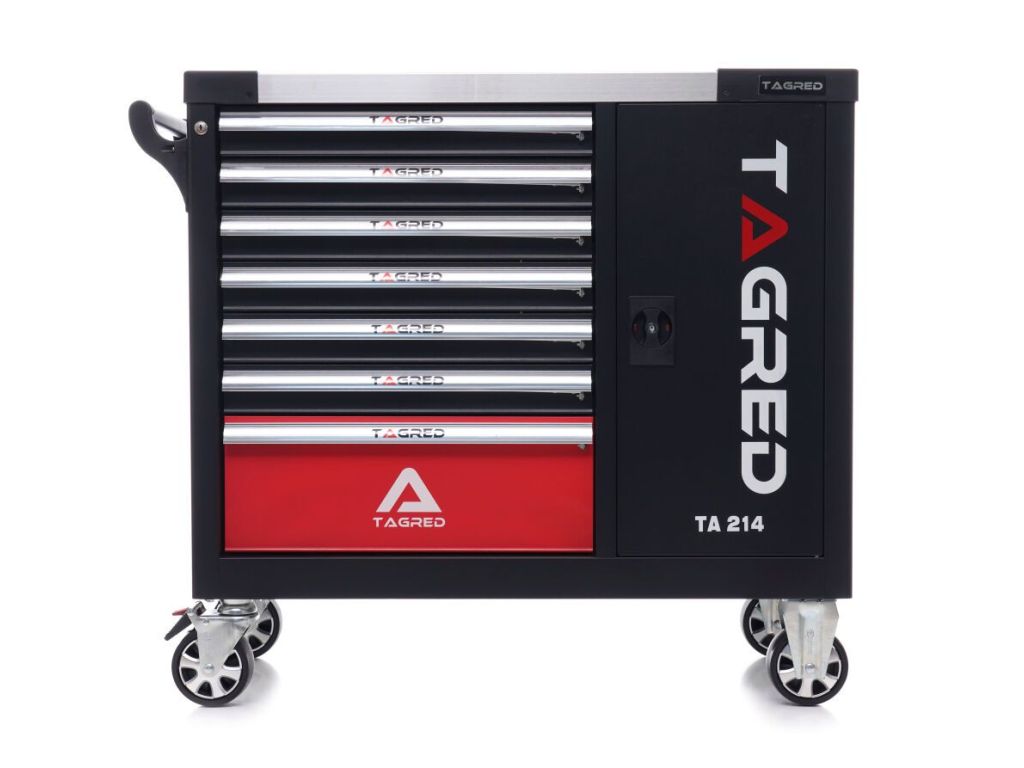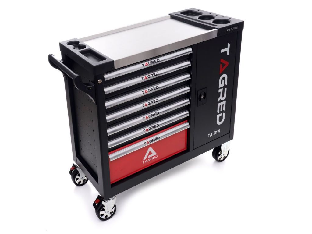 Візок для майстерні з інструментами TAGRED TA214, 298 ел - дозволяє підтримувати порядок на робочому місці та захищає інструменти від крадіжки (візок закривається на ключ). Візок має ергономічні ручки, інтегровані з верхом, і повністю висувні ящики на підшипниках. Центральний замок з двома ключами, що закривають усі ящики, а також подвійні стінки та замок для ящиків. Візок оснащений 4 колесами, включаючи 2 поворотних колеса, що робить її дуже зручною для транспортування. Стільниця універсальна перфорована (з поліпропілену). Тріскачки виготовлені з хромованадієвої сталі CrV6140.