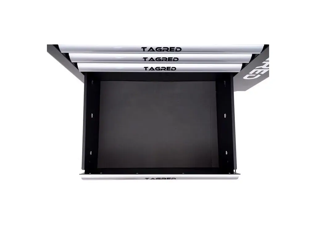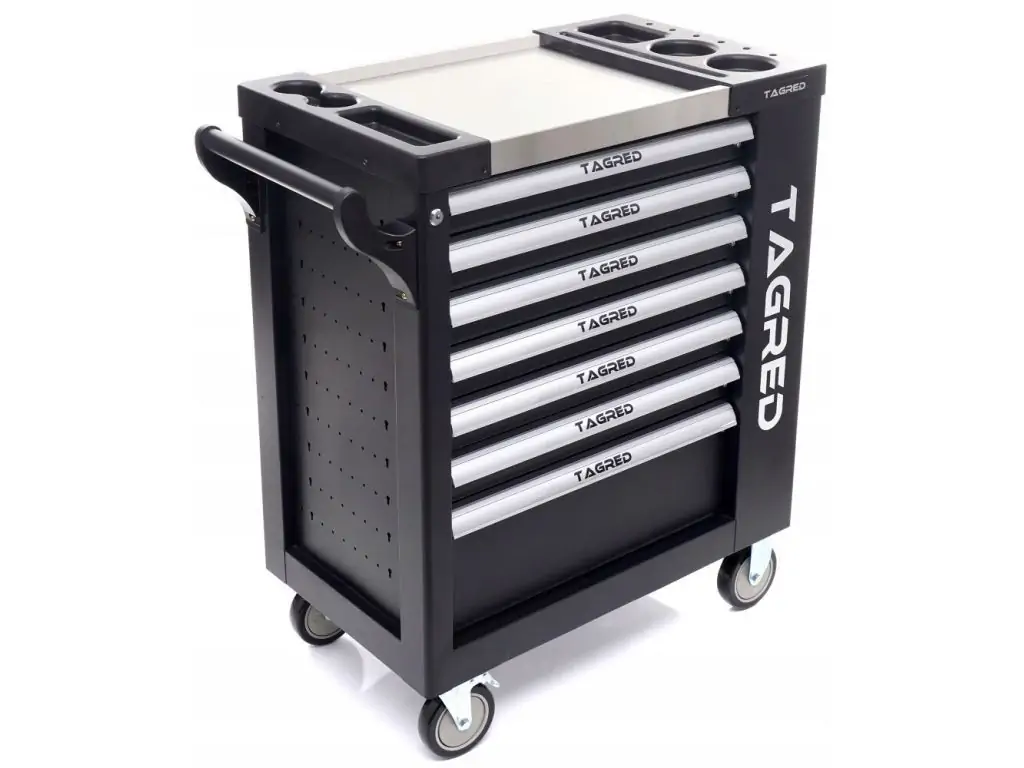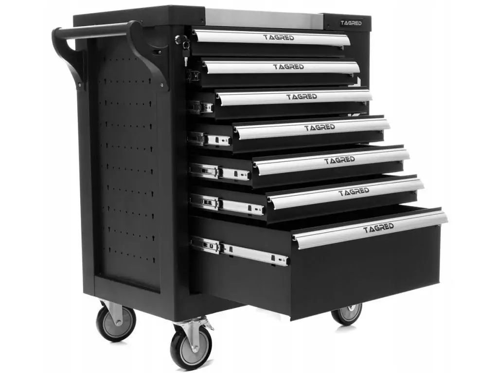 Візок для майстерні TAGRED TA213 з 7 висувними ящиками на кулькових підшипниках і сталевою стільницею відмінно підійде для зберігання інструменту у професійній майстерні, на автосервісі чи у власному гаражі. Велика місткість дозволяє зручно розташувати інструменти, а міцні матеріали виготовлення і додатково укріплені кути забезпечують довготривалу, надійну службу.