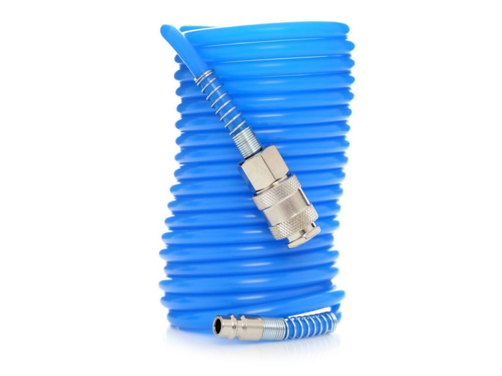 - Спіральний шланг 5 м для підключення пневматичних інструментів, пістолетів-розпилювачів, інших пневматичних пристроїв або подовження пневматичних шлангів.