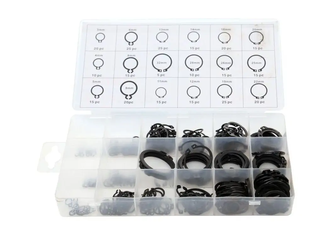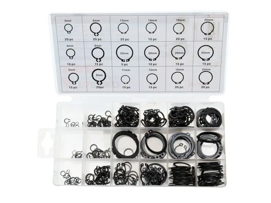 Набір стопорних кілець TAGRED TA1402 - складається з з 300 зовнішніх кілець Seger. Кільця добре тримаються і виготовлені з міцної пружної сталі. Різноманітність розмірів у наборі гарантує, що ви знайдете потрібний розмір. Набір можна використовувати в кожній професійній майстерні.
