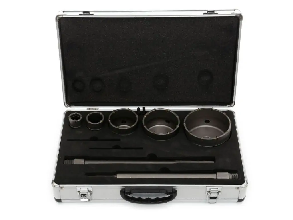 Набір кільцевих коронок для бетону SDS Plus і SDS Max TAGRED TA1510 - виготовлений зі сталі найвищої якості, а вилка - з дуже твердого матеріалу - карбіду. Завдяки адаптеру коронки можна встановлювати в стандартні патрони SDS-PLUS. Адаптери також підходять для встановлення в стандартні затискні головки. Весь набір укладений в дуже естетичний і функціональний кейс для зручного зберігання і транспортування інструментів.