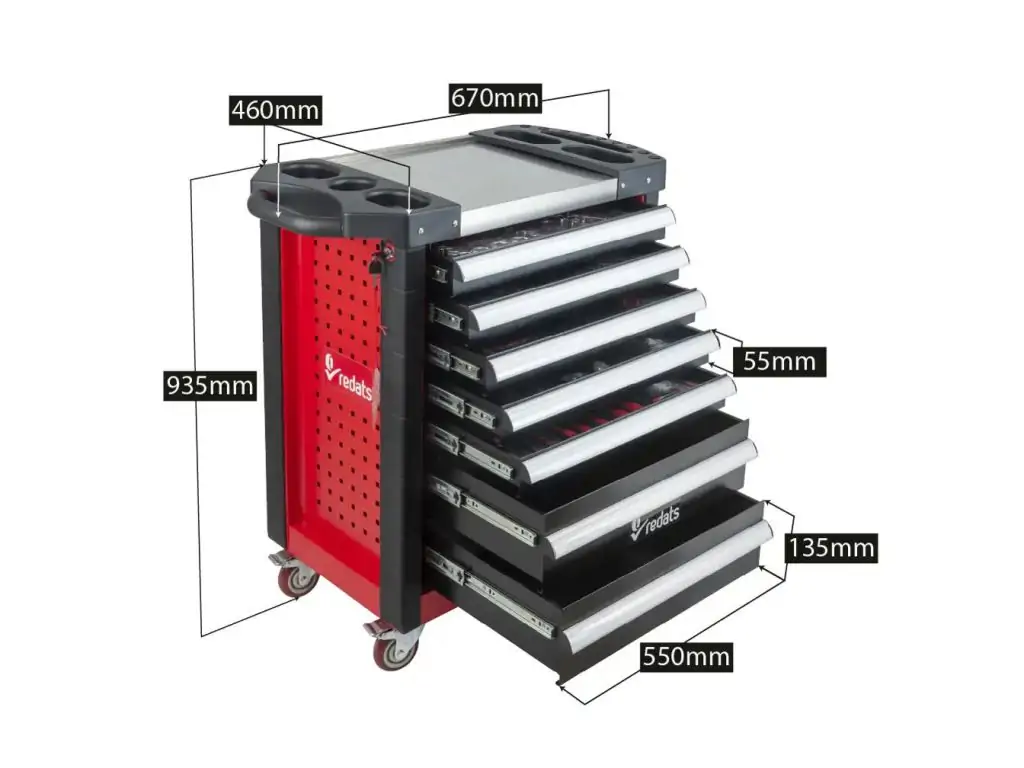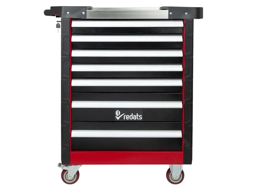 Візок для майстерні з інструментами REDATS буде вигідним придбанням для майстрів будь-якого профілю, адже містить 420 найбільш використовуваних професійних інструментів. 7 ящиків на шарикопідшипникових напрямних закриваються на центральний замок, тому ваш інструмент завжди буде в безпеці. Кожен ящик має сітчасту поролонову підкладку для мінімізації вібрацій і запобігання ковзанню інструменту при транспортуванні. Візок виготовлений з дволистової сталі і доповнений захисними куточками з перфорованої гуми.