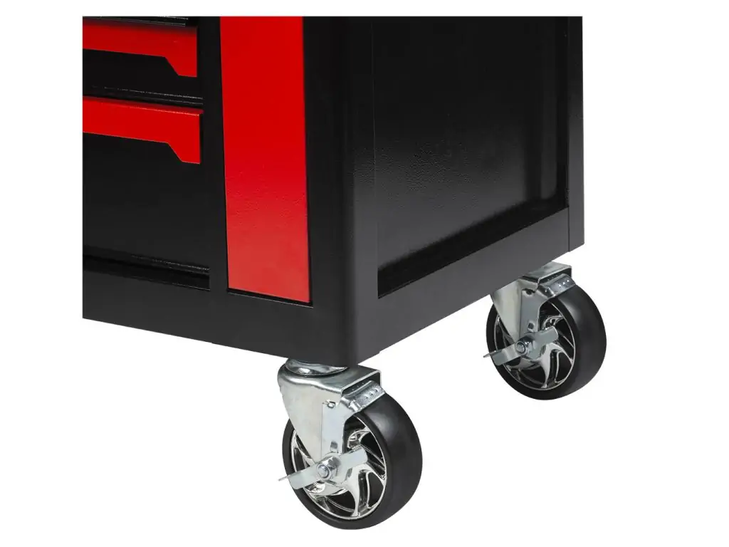 Візок оснащений 4 колесами, 2 з яких фіксовані, а інших 2 - поворотні. Два колеса обладнані стоянковими гальмами. Це дозволяє легко переміщати візок по робочій зоні і надійно зафіксувати його у потрібному місці. Купити цей візок з інструментом в майстерню можна зі швидкою доставкою по Україні.