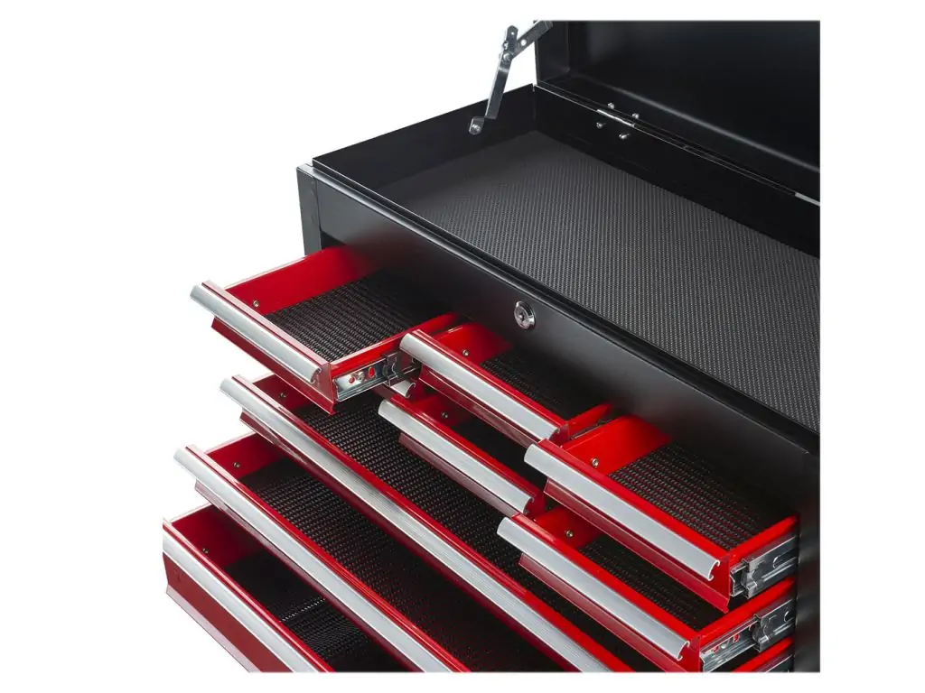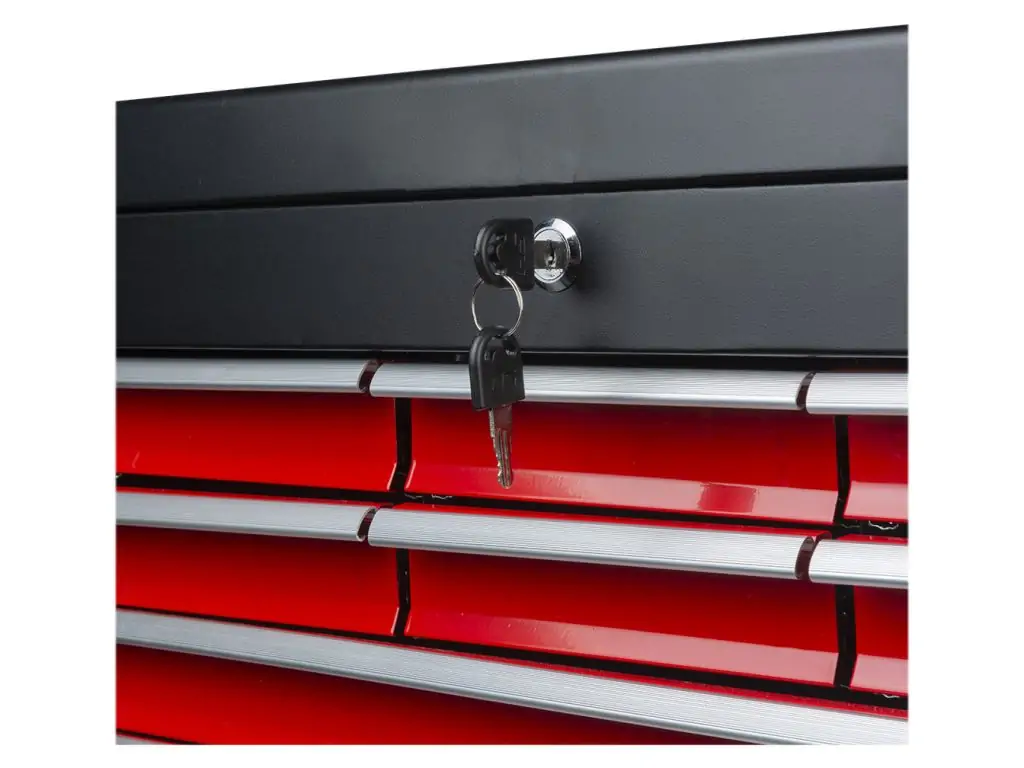 6 шухляд мають розмір 150x225x40 мм, 2 шухляди - 511x225x40 мм, а нижня шухляда - 511x22 x84 мм. Всі шухляди легко висуваються завдяки високоякісним кульковим підшипникам і закриваються на центральний замок, а поролонові вставки запобігають переміщенню інструменту під час транспортування. Верхній відсік з відкидною кришкою забезпечує додаткове місце для зберігання.Стійкі до пошкоджень і зношування матеріали виготовлення гарантують, що цей ящик для інструменту служитиме довго та надійно.