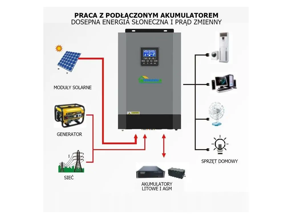 Цей інвертор забезпечує тривале безперебійне живлення електричних пристроїв, що потребують живлення 230В змінного струму, з можливістю вибору пріоритету живлення: мережа або сонячна батарея. Завдяки компактному дизайну його можна встановити навіть у невеликих приміщеннях або транспортних засобах.
