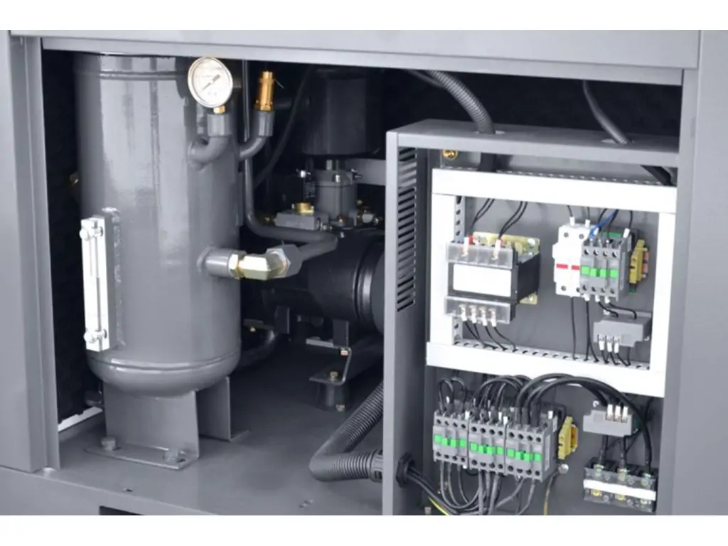 низький рівень шуму гвинтового компресора завдяки спеціально розробленому звукоізоляційному кожуху (шумоізоляційні плити);