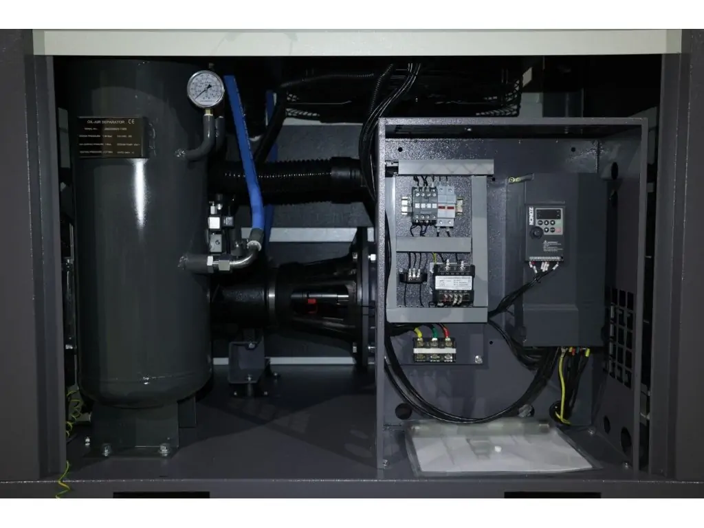 Інверторні гвинтові компресори оснащені частотним перетворювачем (інвертором), який регулює швидкість обертання двигуна, автоматично підлаштовуючи продуктивність компресора до поточного споживання повітря. Це дозволяє економити енергію та забезпечувати стабільний тиск у системі.