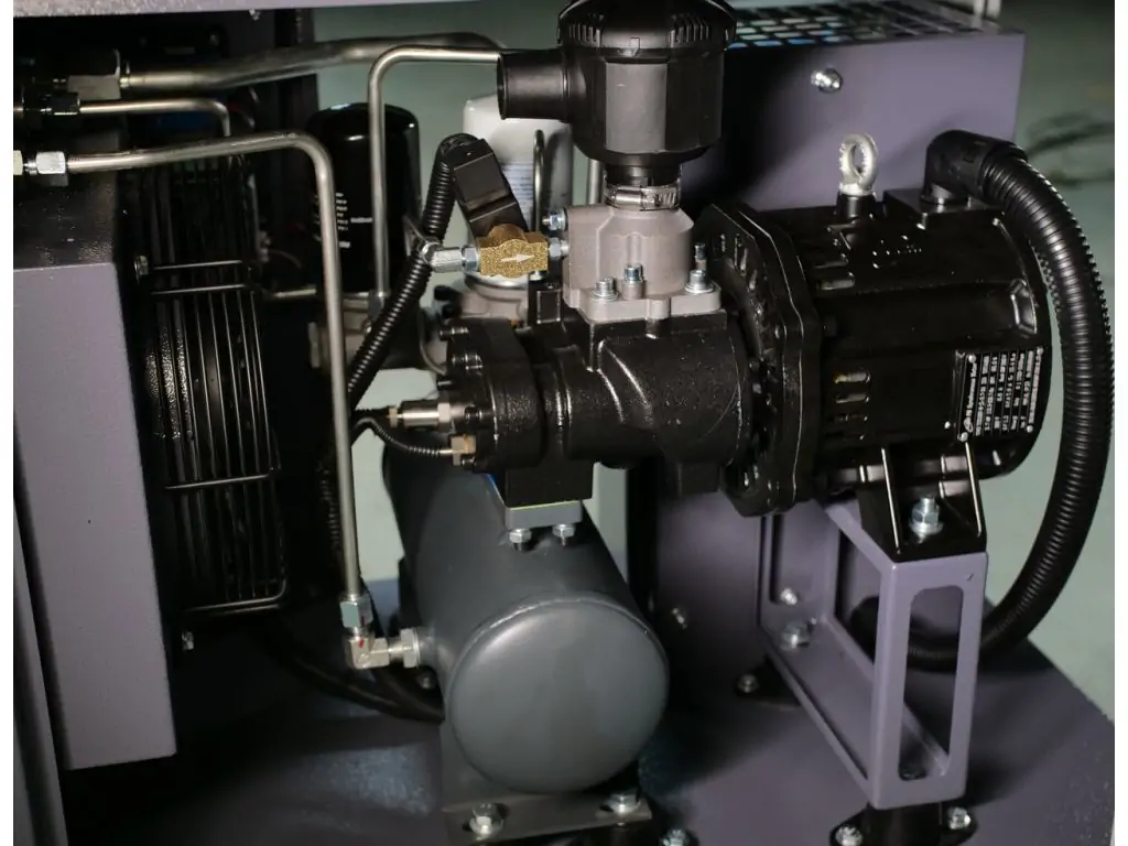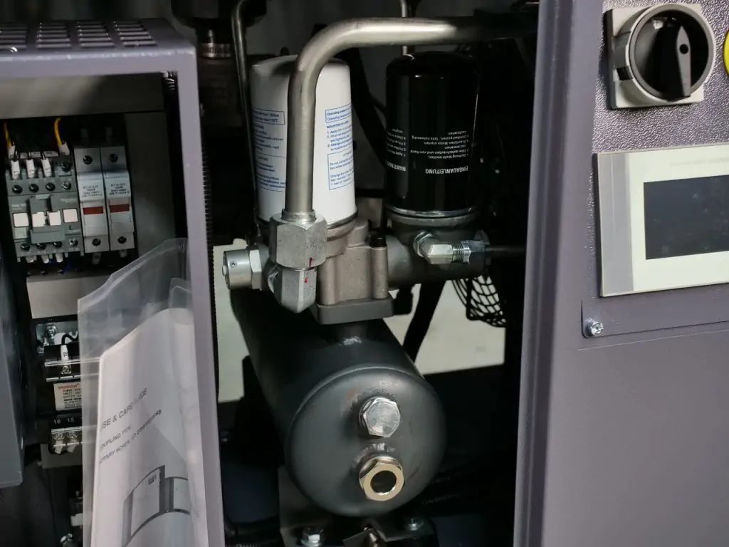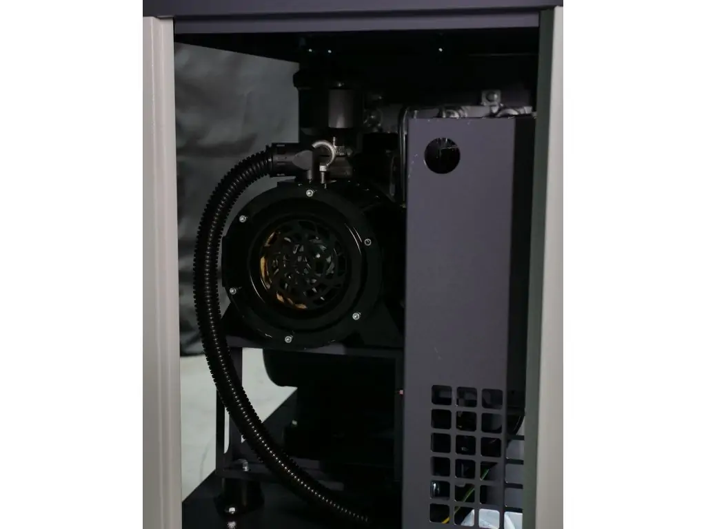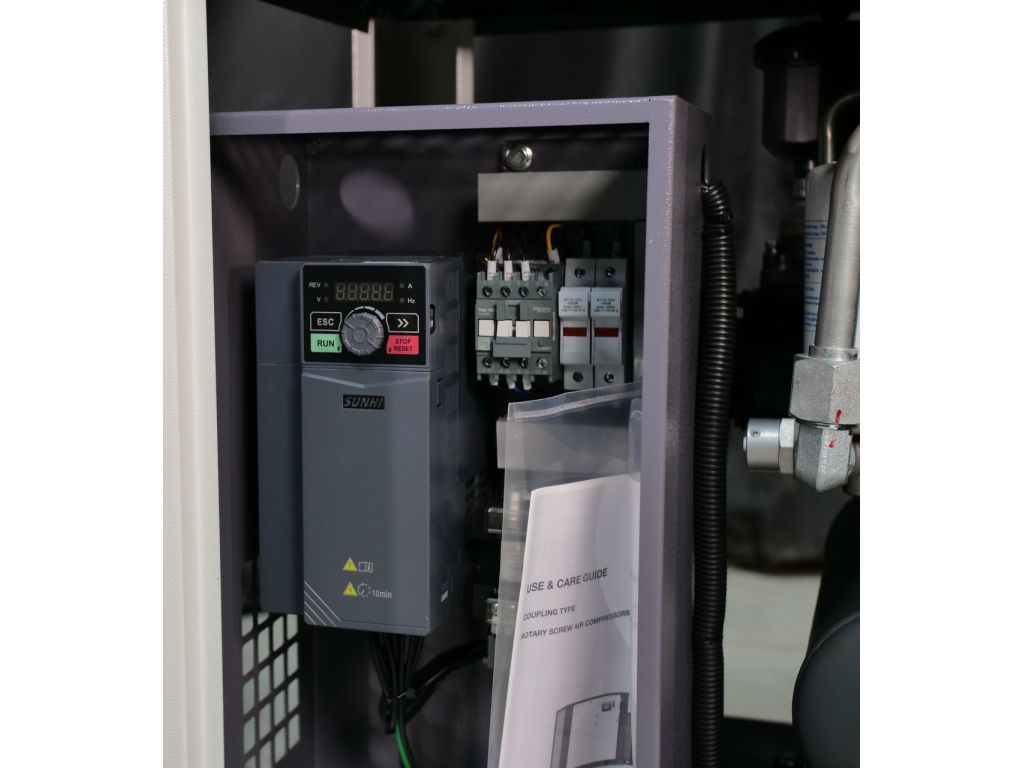 Ще однією перевагою вбудованого інвертора є регулювання обертів двигуна залежно від поточного навантаження, що дозволяє економити до 35% електроенергії і збільшити робочий ресурс компресора. У поєднанні з високою питомою потужністю і вищим ККД двигуна на постійних магнітах це робить обладнання надзвичайно енергоефективним і сприяє швидкій окупності. Також цей гвинтовий компресор 220 В з інвертором оснащений гвинтовим блоком Baosy та електронними компонентами марок CHINT і Schneider Electric, що гарантує його надійну та довготривалу службу.