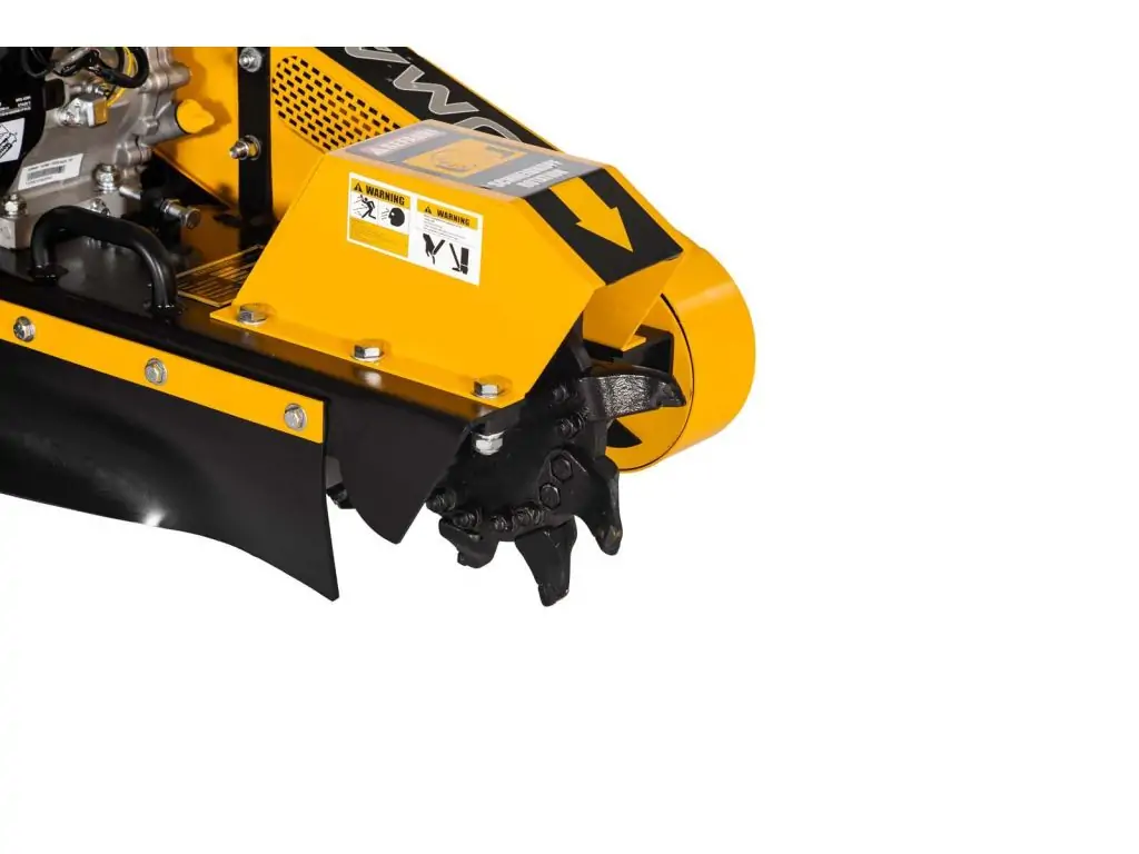 Ширина подрібнювача - усього 80 см, що дозволяє без проблем проїжджати у вузькі проходи і у важкодоступні місця. Великі колеса з протекторами забезпечують легке пересування по нерівних поверхнях, а ергономічна, регульована ручка робить керування зручним і простим. За рахунок міцної конструкції з високоякісних матеріалів, цей подрібнювач пеньків стійкий до деформацій і зношування та має довготривалий термін служби.