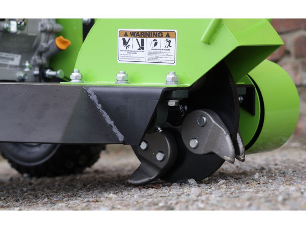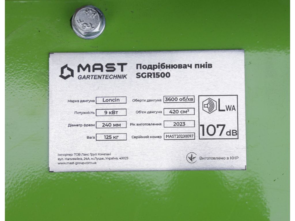 Подрібнювач пнів MAST Gartentechnik SGR1500 - це професійний інструмент, призначений для подрібнення пнів і коренів дерев. Видаляє надземну і підземну частини кореня, не пошкоджуючи навколишній грунт. Висота подрібнення становить 56 см, глибина - 33 см. Завдяки невеликій, добре продуманій конструкції може працювати на вузьких, важкодоступних ділянках шириною 600-700 мм. Головний робочий механізм подрібнювача - високоміцний металевий ріжучий диск з 8-а вольфрамовими зубами.