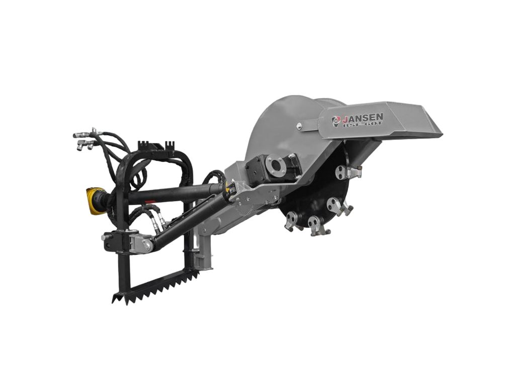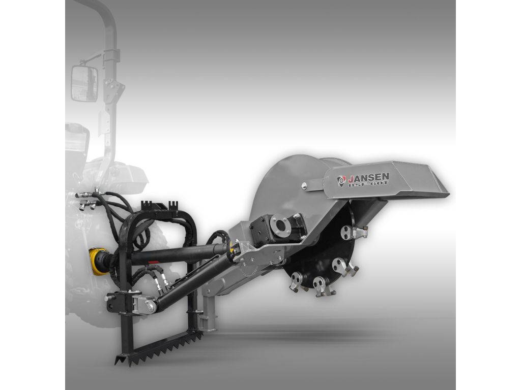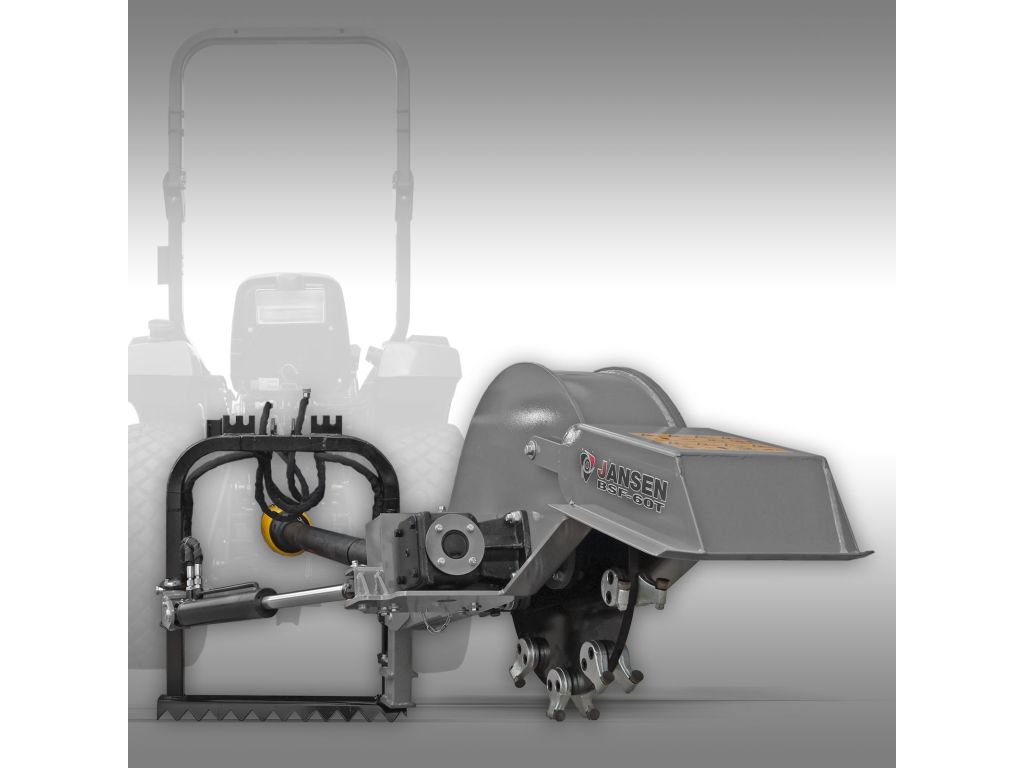 Подрібнювач пнів на трактор Jansen BSF-60T працює від валу відбору потужності трактора, приєднуючись за допомогою заднього 3-точкового навісу (сумісність з категоріями I і II). Необхідна потужність трактора - 30-60 к.с.