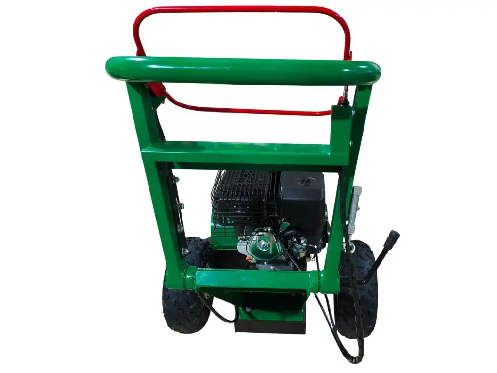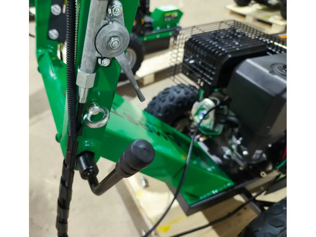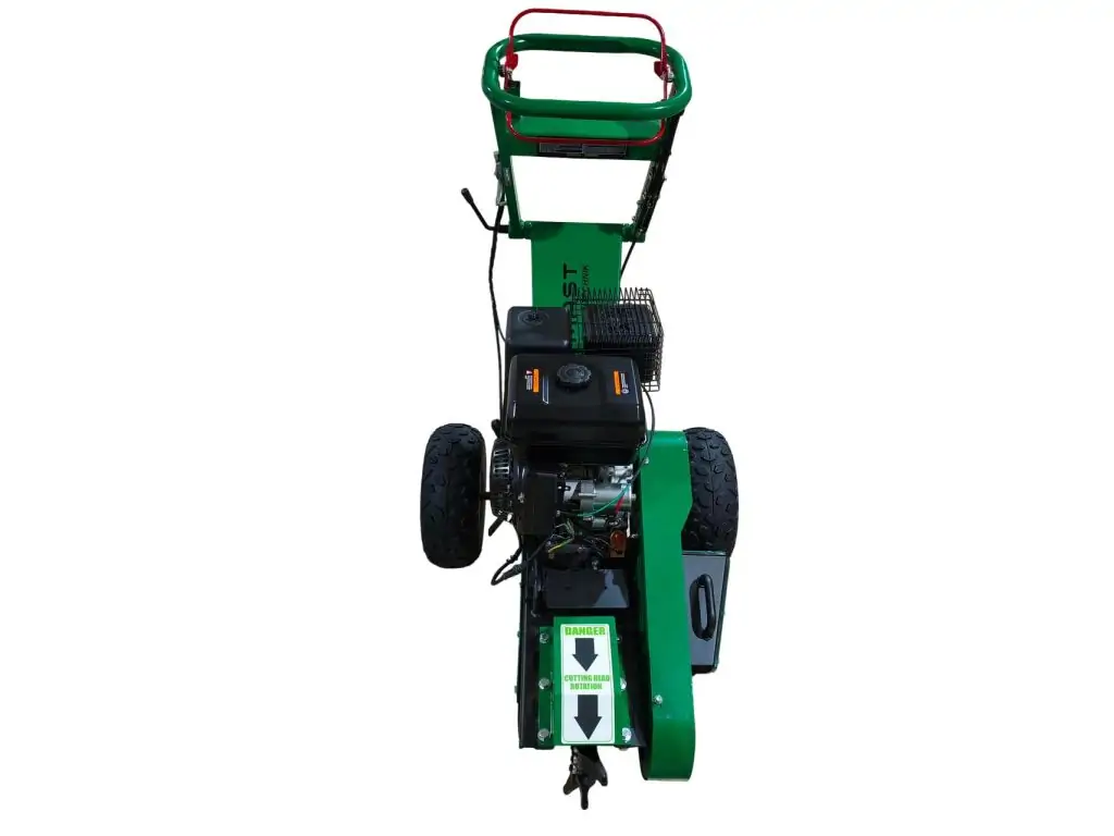 Для максимальної ефективності подрібнення зуби фрези розташовані у 3 площинах (прямі, ліві, праві). Завдяки ширині 80 см подрібнювач без проблем проходить у хвіртки, ворота і вузькі проходи. Великі колеса з протектором легко проїжджають по нерівних поверхнях, а регульована ергономічна ручка налаштовується під зріст оператора, що зменшує навантаження на спину. Конструкція з міцної сталі забезпечує зносостійкість і тривалий термін служби. Для захисту оператора від травмування цей фрезер для пнів оснащений важелем безпеки, при відпусканні якого двигун миттєво зупиняється.