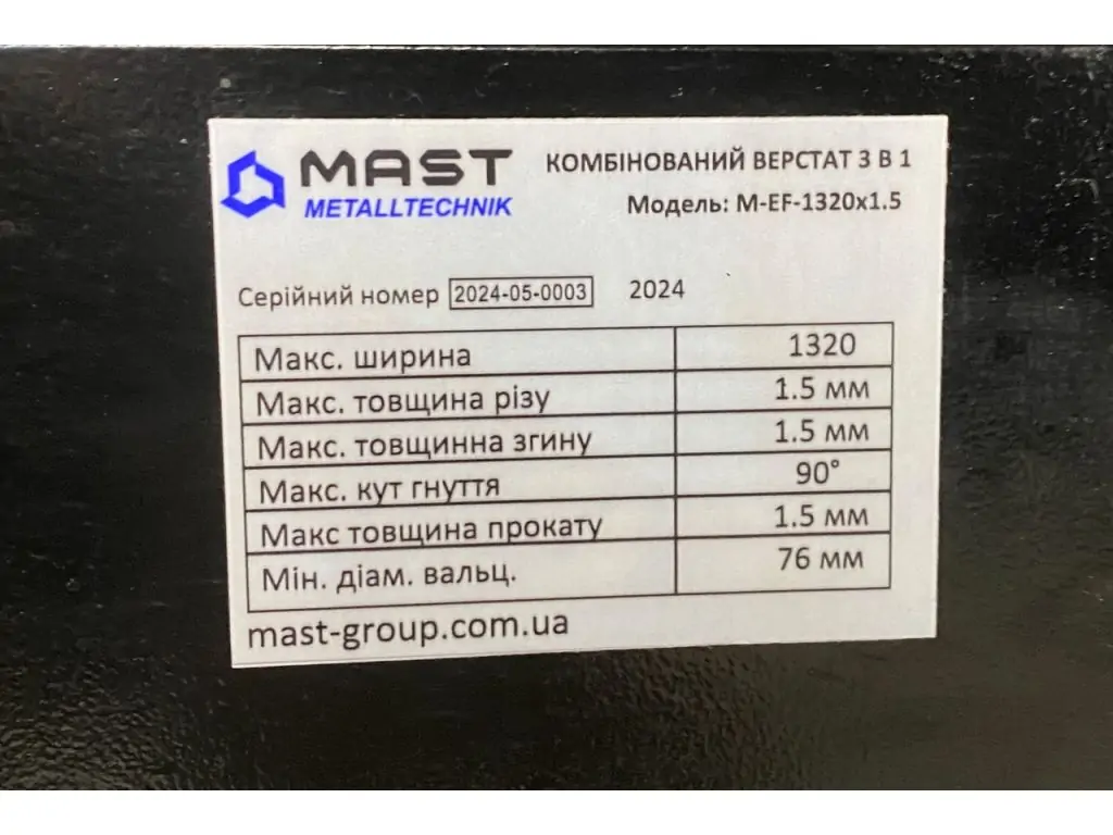 Гарантійний термін на комбінований листозгинальний верстат MAST Metalltechnik M-EF-1320x1.5 становить 12 місяців.