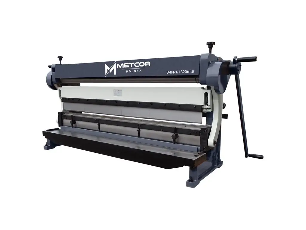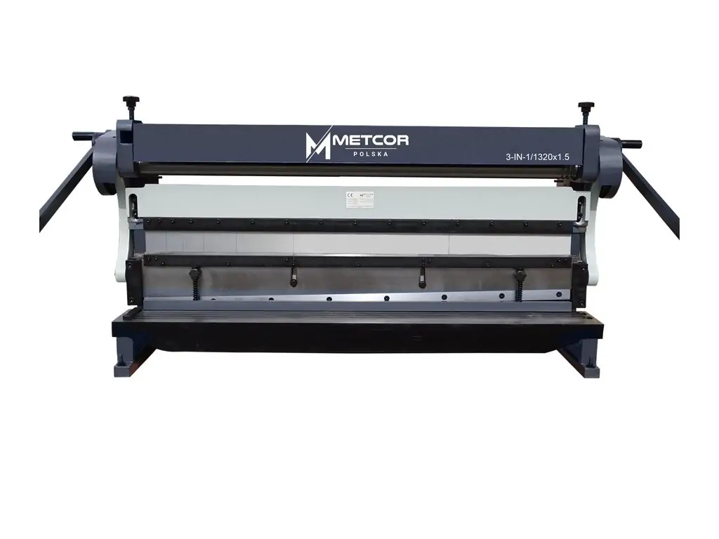 Комбінований верстат METCOR 1320x1.5 поєднує в собі функції гільйотини, вальців і сегментного листозгина, що робить його універсальним рішенням для невеликої майстерні чи малого виробництва. Розрахований на роботу з листовим металом товщиною до 1,5 мм. Максимальний кут згину становить 90°. Робоча ширина - 1320 мм.
