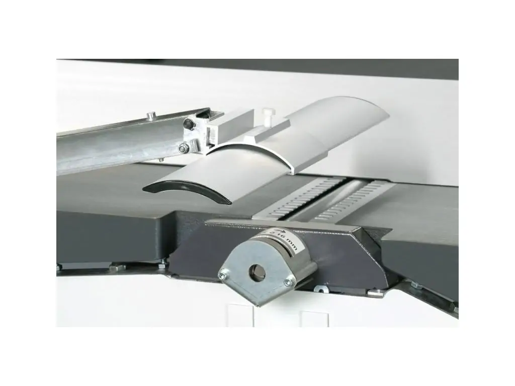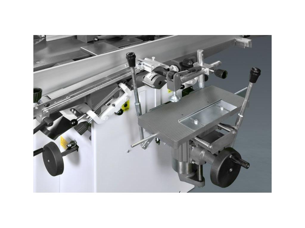 Все станки оснащены фронтальным столом с поддерживающей телескопической опорой и поперечной упорной линейкой с 2-мя откидными упорами. Это позволяет обрабатывать на станке листовые материалы, также возможно увеличение длинны каретки до 2050 мм.