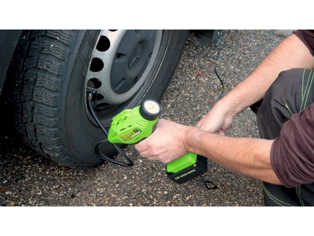 Компресор забезпечує максимальний тиск 6,8 Бар, для контролю тиску є манометр. Гнучкий шланг довжиною 50 см і 3 адаптери (для м'ячів, для велосипедних шин та конічний адаптер) забезпечують зручну і легку експлуатацію. Пристрій може безперервно працювати до 5 хвилин, після чого потрібна зупинка для охолодження. Компактний розмір і вага близько 2 кг дозволяють брати цей портативний компресор на акумуляторі з собою в дорогу і зберігати його в багажнику автомобіля.