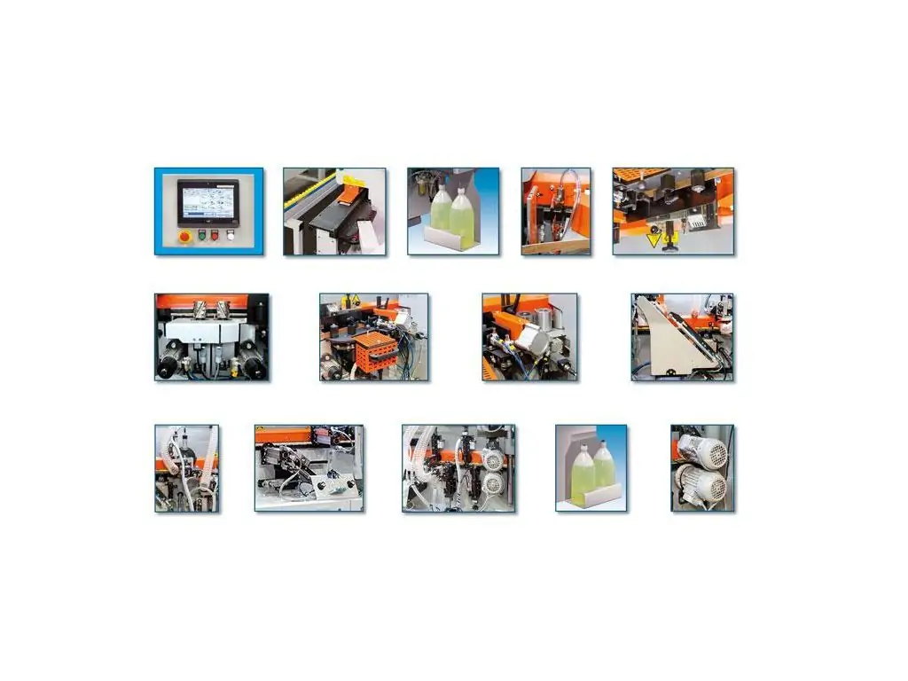 Верстат має гільйотину для попереднього розрізання профілів PVC / ABS кантів, а також зону притиску з трьох роликів, велика з яких примусово приводиться в рух, та двох конусних роликів. Для вертикального торцювання використовуються два HF двигуни з частотою 200 Гц і швидкістю близько 12 000 об / хв. Також є вузол для верхнього і нижнього зняття звисів з вертикальним і горизонтальним налаштуванням з двох HF двигунів.