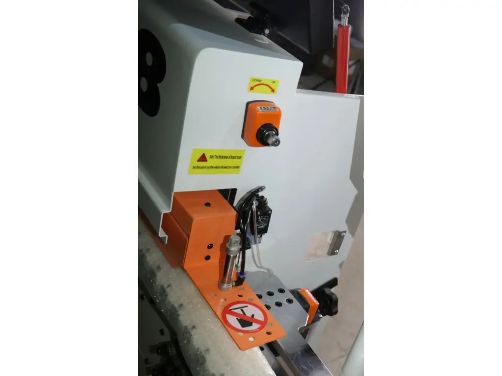 Підйом/опускання притискної балки проводиться вручну. Верстат обладнаний лічильником кількості деталей і довжини кромки, а також системою захисту від попереднього запуску деталі.