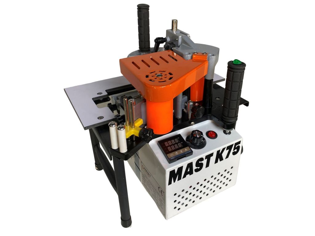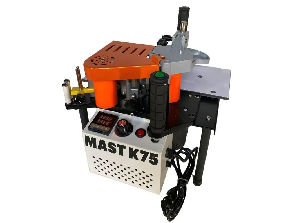 Ручний кромкоклеючий верстат MAST Holztechnik K75 призначений для облицювання прямолінійних і криволінійних меблевих деталей ПВХ, ABS і меламіновою кромкою товщиною 0,3-3 мм, шириною 10-55 мм. Може використовуватися як портативний пристрій і як стаціонарний верстат (стіл для встановлення доступний до замовлення опційно). Працює від мережі 230 В.