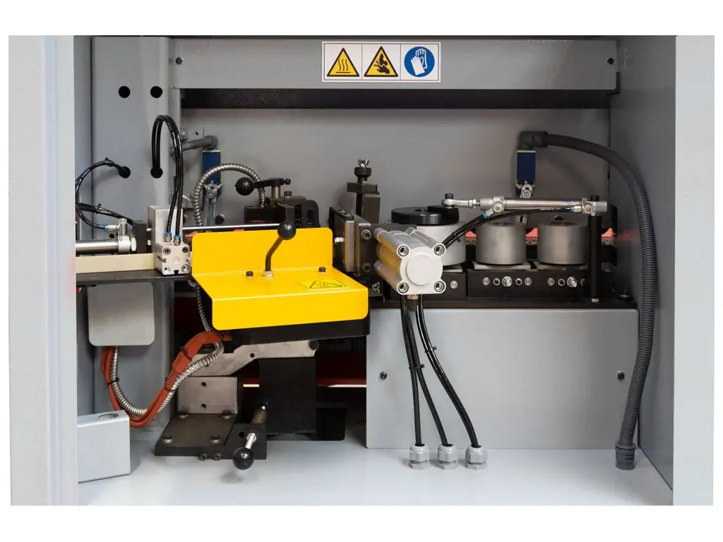 Клейовий вал зі спеціальною поверхнею забезпечує рівномірне нанесення клею. Температуру клею можна регулювати з сенсорного дисплея. Прогумовані притискні ролики з автоматичним налаштуванням притиску забезпечують точне і якісне з’єднання кромки із заготовкою. Масивна, жорстка станина гасить вібрації і підтримує стабільність обробки. Додатковою перевагою моделі є інтегрована витяжна система, завдяки якій цей верстат кромкоклеючий має чисту, безпилову роботу.