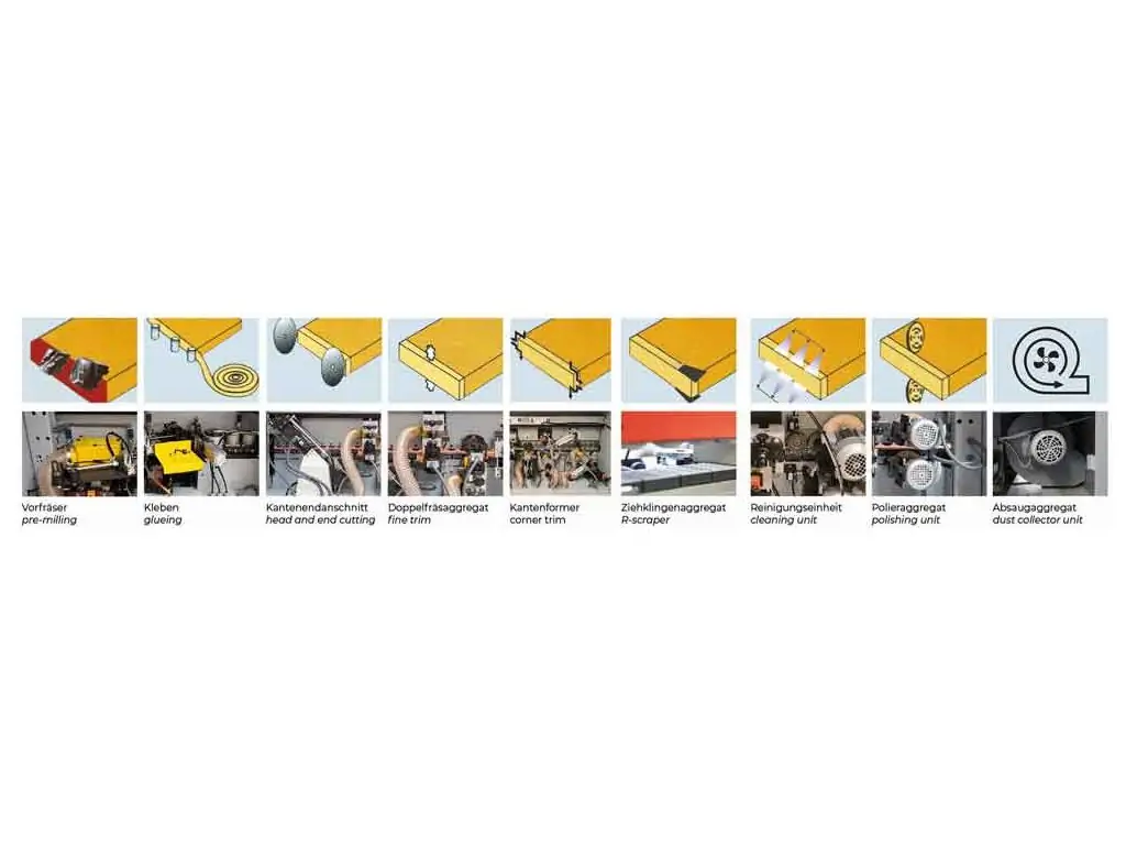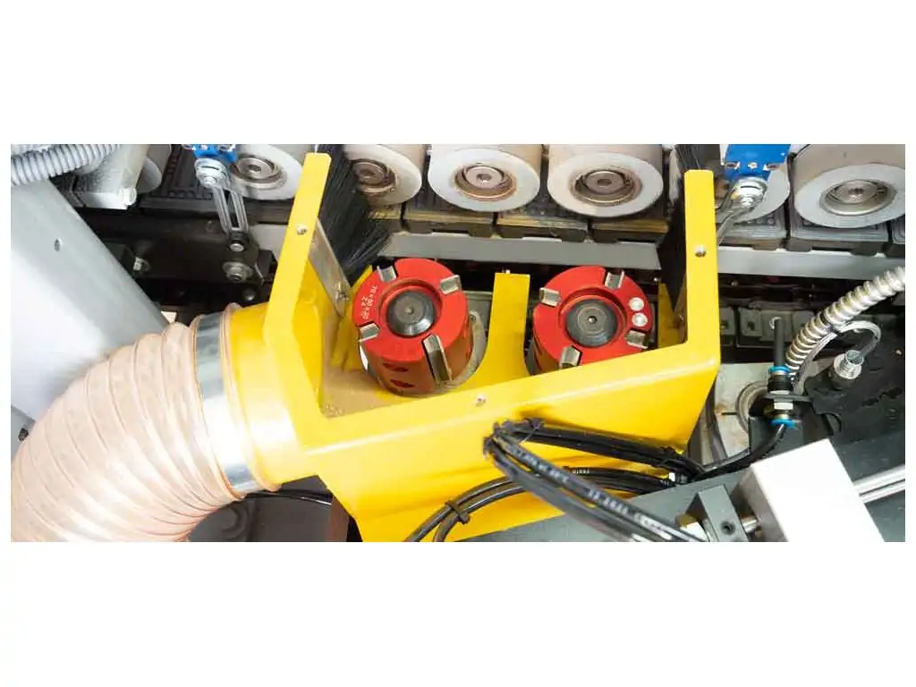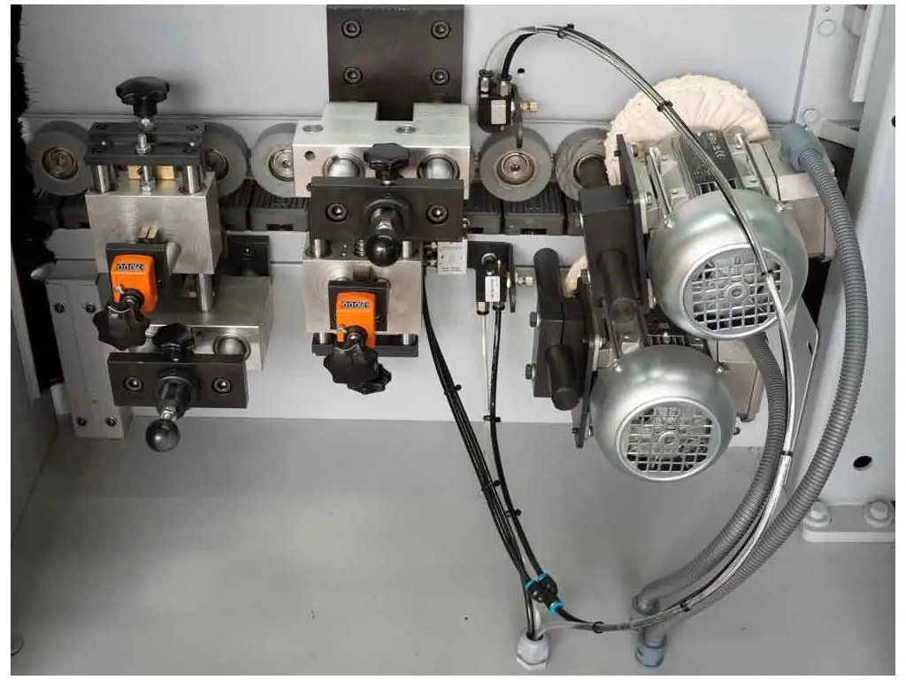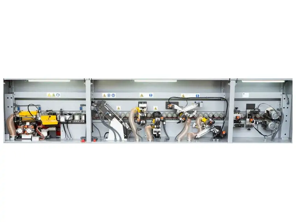 Клейовий ролик має спеціальну поверхню, що забезпечує точне і рівномірне нанесення клею. Температуру клею можна регулювати за допомогою сенсорного дисплея. Високоякісні притискні ролики забезпечують ідеальне з’єднання кромки і заготовки. Тиск роликів налаштовується автоматично. Панель керування зі зрозумілим інтерфейсом дозволяє зручно відстежувати і коригувати параметри роботи, а масивна, жорстка станина підтримує стабільність і точність обробки. Завдяки високій продуктивності і широкому функціоналу, цей автоматичний кромкоклеючий верстат відмінно підходить для середніх меблевих виробництв.