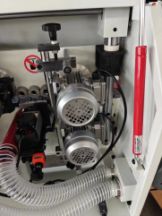 Подача заготовки здійснюється за допомогою ланцюгового конвеєра з гумовими накладками, швидкість подачі становить 12 м/хв. Клейовий бак з електронним контролем температури, гвинтове налаштування кількості клею і високоточний клейовий валик забезпечують оптимальну температуру клею і його рівномірне нанесення. Притискні ролики гарантують рівномірний контакт кромки з деталлю. Фрезерний вузол зняття звисів і полірувальний вузол здійснюють фінішну обробку кромки. Цей кромкооблицювальний верстат автомат обладнаний пультом управління українською мовою, що дозволяє зручне керування кожним вузлом і максимальний контроль робочого процесу.