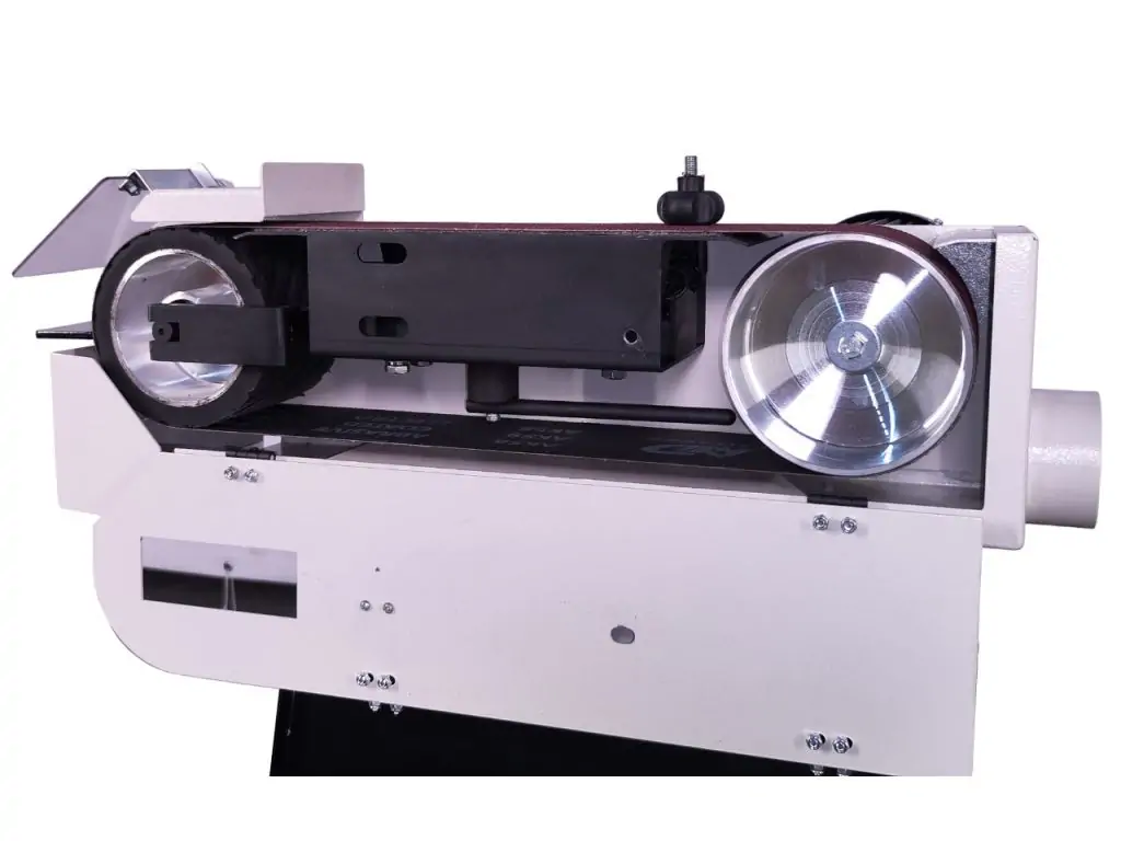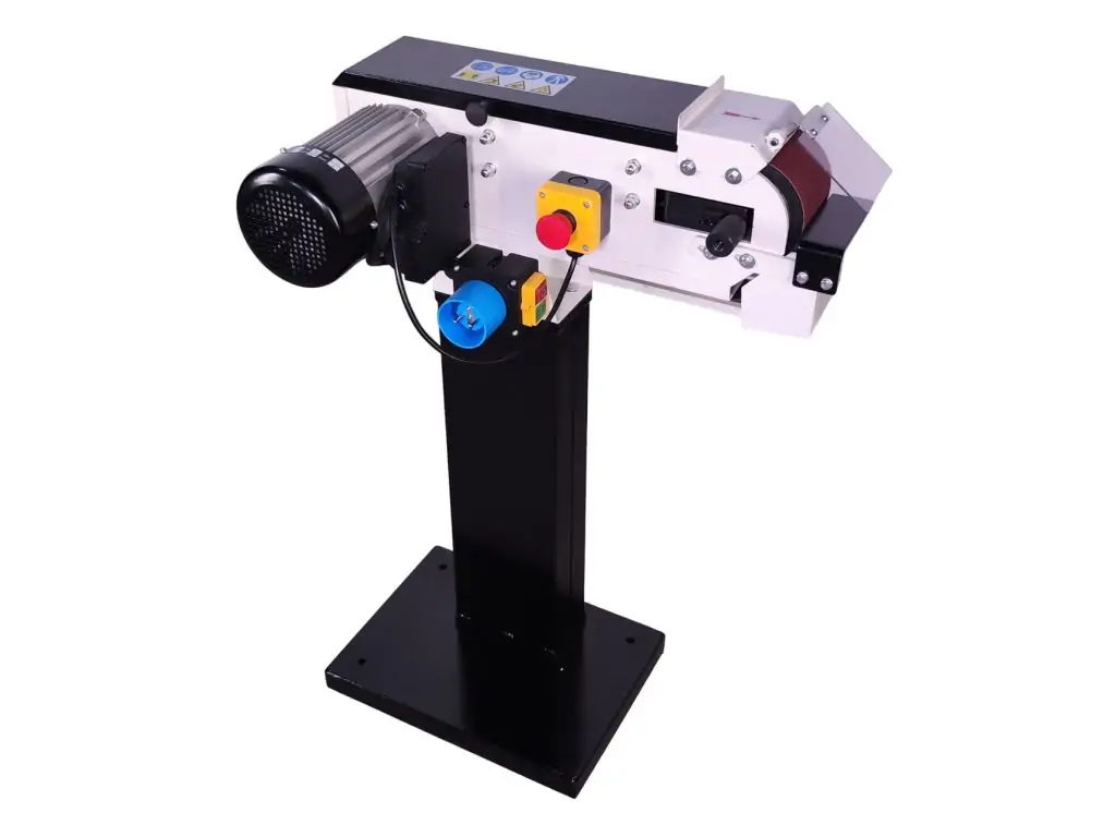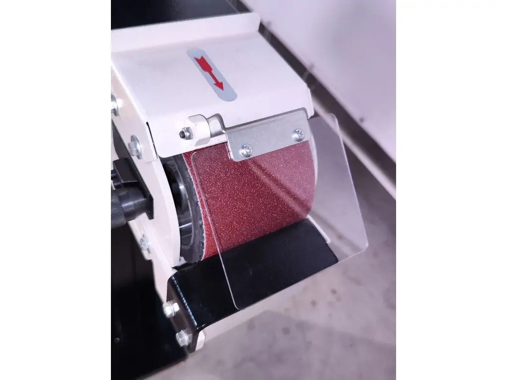 Верстат має 2 робочі зони - спереду для чистової обробки торців і зверху для усунення дефектів і нерівностей поверхні. Рух шліфувальної стрічки здійснюється по роликах з гумовим покриттям. Стрічку можна легко замінити на більш чи менш абразивну. Для зменшення паразитного тертя під стрічкою розміщена графітова підкладка. Виготовлена з міцної листової сталі конструкція забезпечує стабільну роботу при будь-яких навантаженнях. Компактний розмір дозволяє зручно використовувати верстат в умовах обмеженого простору. Замовити цей шліфувальний верстат ціна якого дуже приємна, можна на сайті KMA.UA.