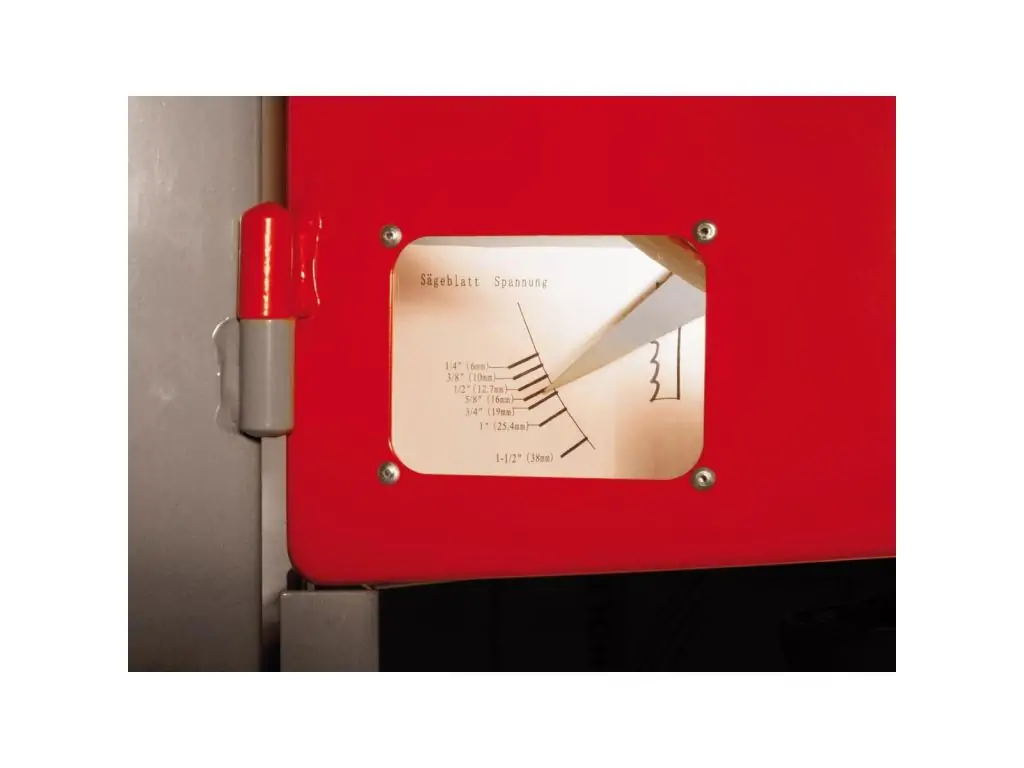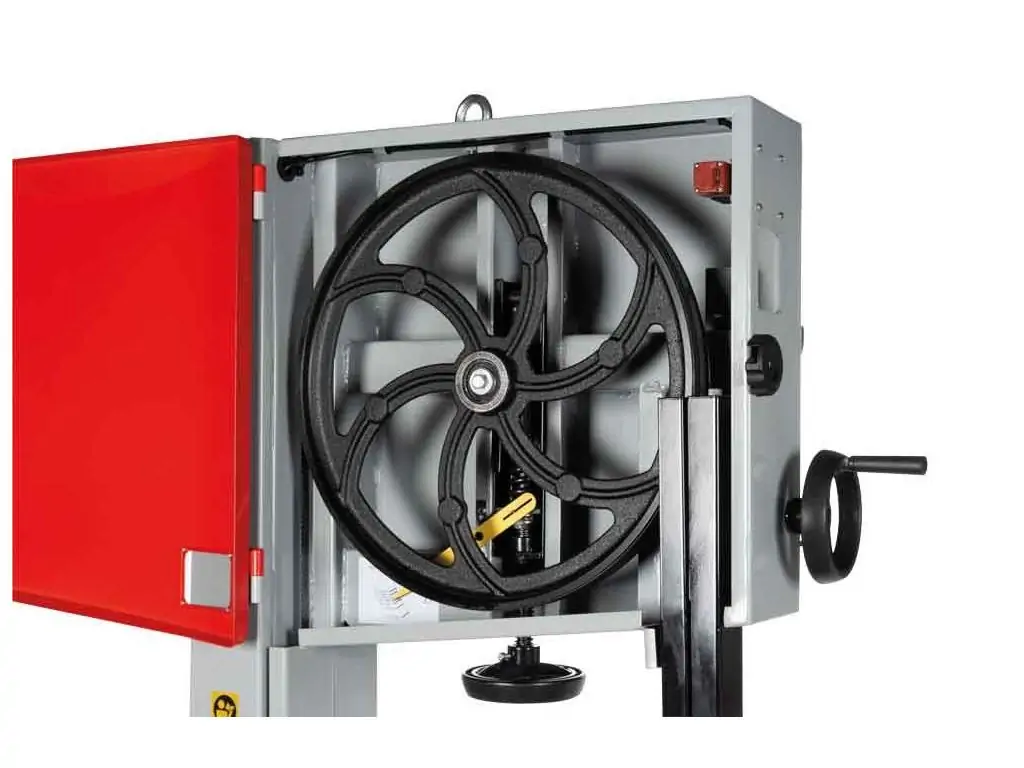Литі чавунні шківи з гумовим покриттям забезпечують плавний і рівномірний рух стрічки. Чавунний стіл розміром 530х480 мм служить стабільною опорою для заготовки, а його нахил від -10° до +45° дозволяє розпил під кутом. Для швидкого і точного налаштування ця потужна стрічкова пила для майстерні має паралельний упор з лупою та вимірювальною шкалою.