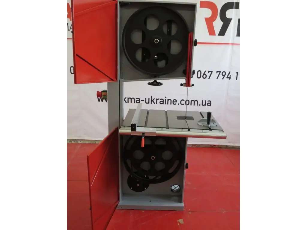 ![]() | Литі шківи з сірого чавуну, на відміну від алюмінієвих шківів, володіють великою масою й інерцію, тому не знижується їх швидкість і пила поводиться стабільно при різанні, особливо при вході в заготовку. Кожен шків проходить балансування. На нижньому шківі щітка для очищення від тирси. Шківи обгумовані. |