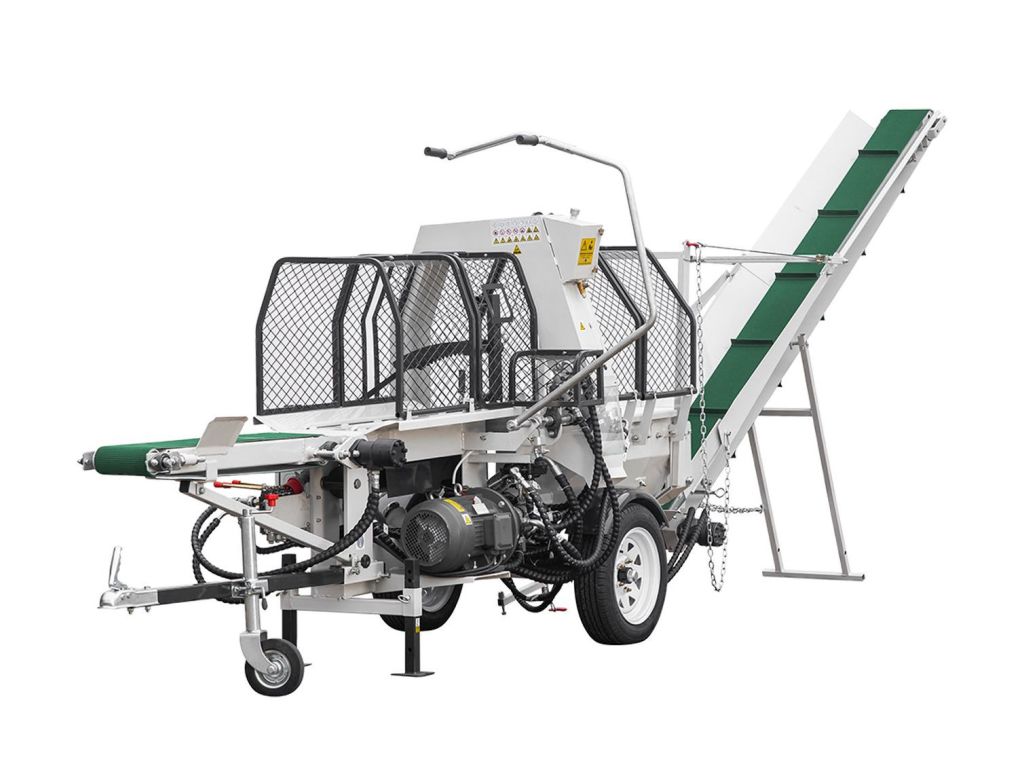 Гідравлічна ланцюгова пила розпилює колоду по всій довжині, а гідравлічний хрестоподібний клин розколює її на 4 частини. Подача колоди до ріжучого блока і вивантаження дров здійснюються автоматично, за допомогою гідравлічного стрічкового конвеєра довжиною 3,2 м. Для захисту від вильоту стружки і випадіння колод є захисна огорожа, а для переміщення обладнання - 2 великих колеса і фаркоп. Потужний функціонал і надійна конструкція дозволяють успішно використовувати цей напівавтоматичний дроворіз для бізнесу (комунальні підприємства, підприємства по заготівлі дров тощо), а також у великих приватних господарствах.