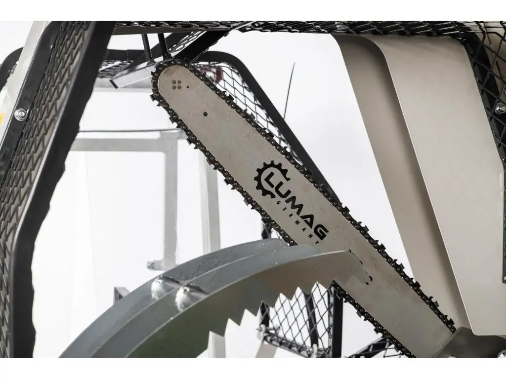Напівавтоматична машина для різання і розколу дров Lumag SSA500ZH-PRO, гідравлічний - це комбінація трьох верстатів. Ланцюгова пила розпилює деревину на потрібну довжину, потім колун розколює попередньо розрізаний брусок на дві або чотири частини, і оброблена деревина транспортується стрічковим конвеєром у вибране місце.