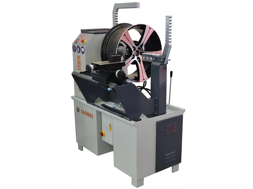 Ремонтно-токарний гідравлічний верстат Carmec PRC 2400 призначений для виправлення та відновлення всіх видів сталевих, алюмінієвих та легкосплавних дисків діаметром 10-24”. Вирівнювання дисків здійснюється за допомогою гідравлічного циліндра, який приводиться у дію приводом потужністю 0,75 кВт, і набору формованих пуансонів. Система регулювання тиску з манометром дозволяє точно налаштувати силу натискання. Для видалення вм'ятин і дефектів, а також слідів після виправлення використовується вбудований токарний модуль з окремим двигуном 0,75 кВт.