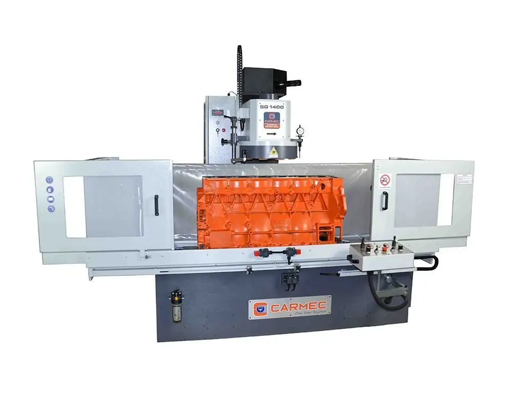 Плоскошліфувальний верстат Carmec SG-1400 - це спеціалізоване обладнання для шліфування та фрезерування площини ГБЦ та БЦ з метою відновлення площинності поверхні, що контактує з прокладкою. Підходить для обробки чавунних та алюмінієвих деталей. Максимальна довжина обробки становить 1200 мм, що дозволяє працювати з більшістю ГБЦ та БЦ легкових автомобілів і середніх вантажівок.