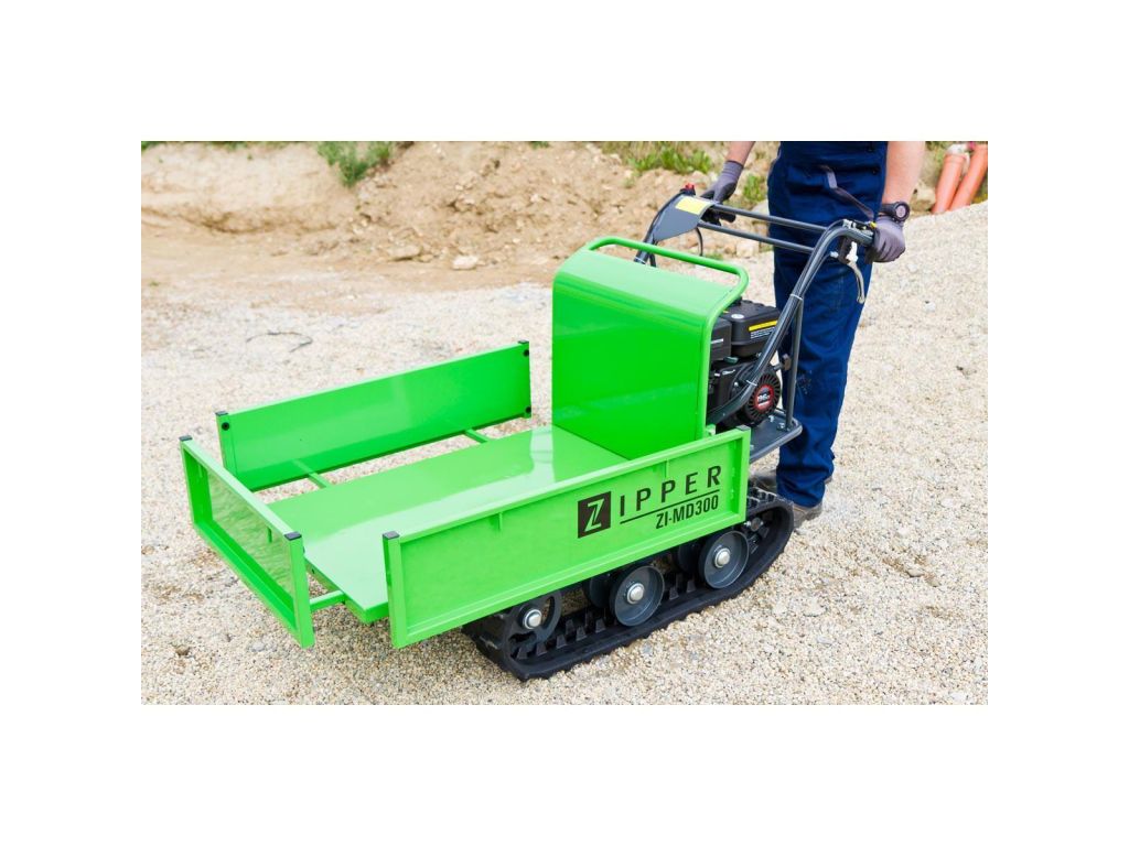 Думпер гусеничний, міні самоскид Zipper ZI-MD300 призначений для перевезення сипучих матеріалів по різних місцевостях. Відмінно впорається з транспортуванням піску, гравію, каменю, будівельного і побутового сміття вагою до 300 кг. Завдяки компактній конструкції без проблем проїжджає по вузьких доріжках і у невеликі ворота. Обладнаний бензиновим двигуном потужністю 4,1 кВт.