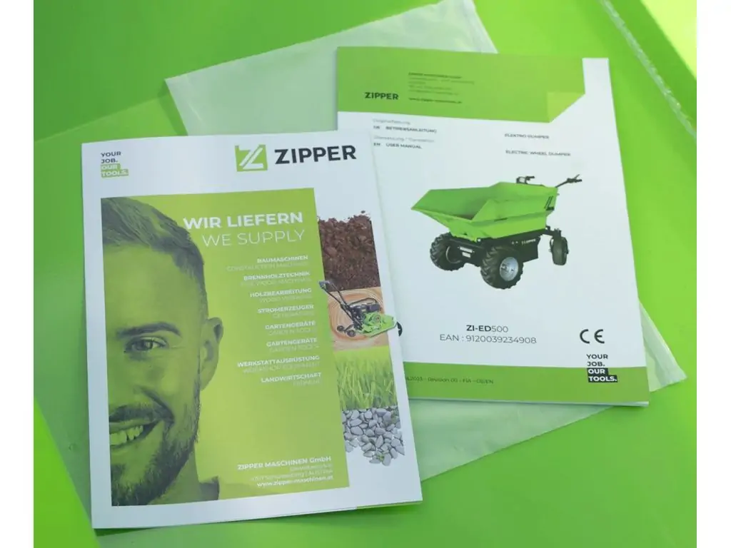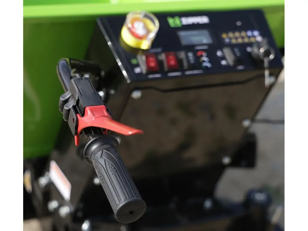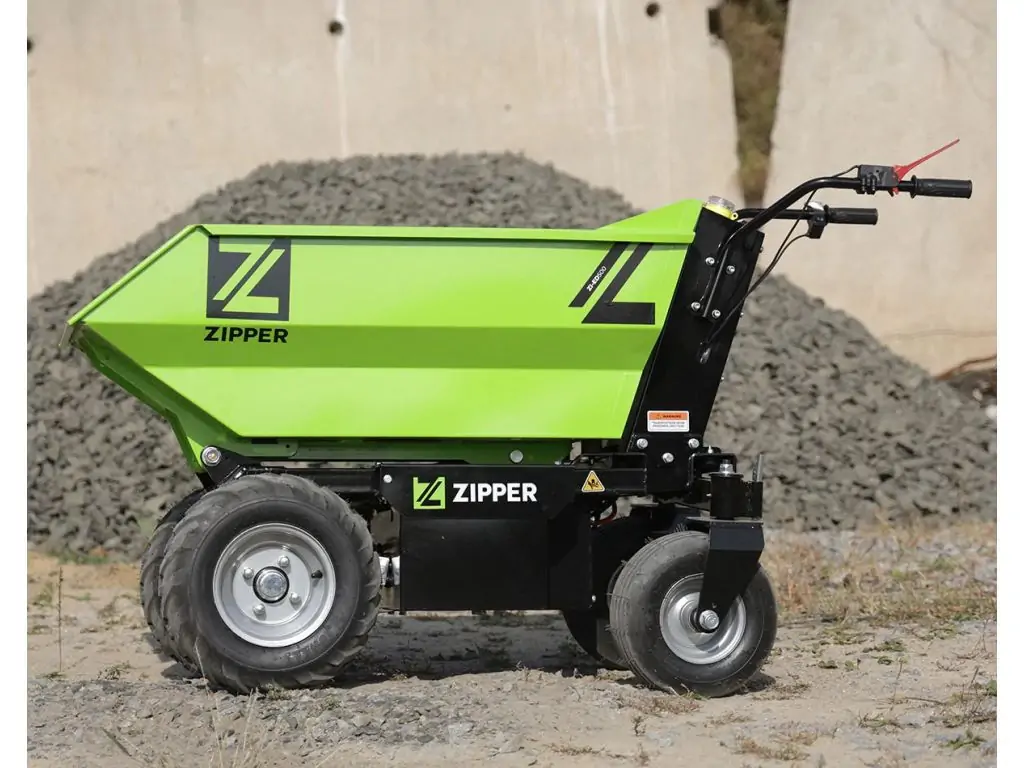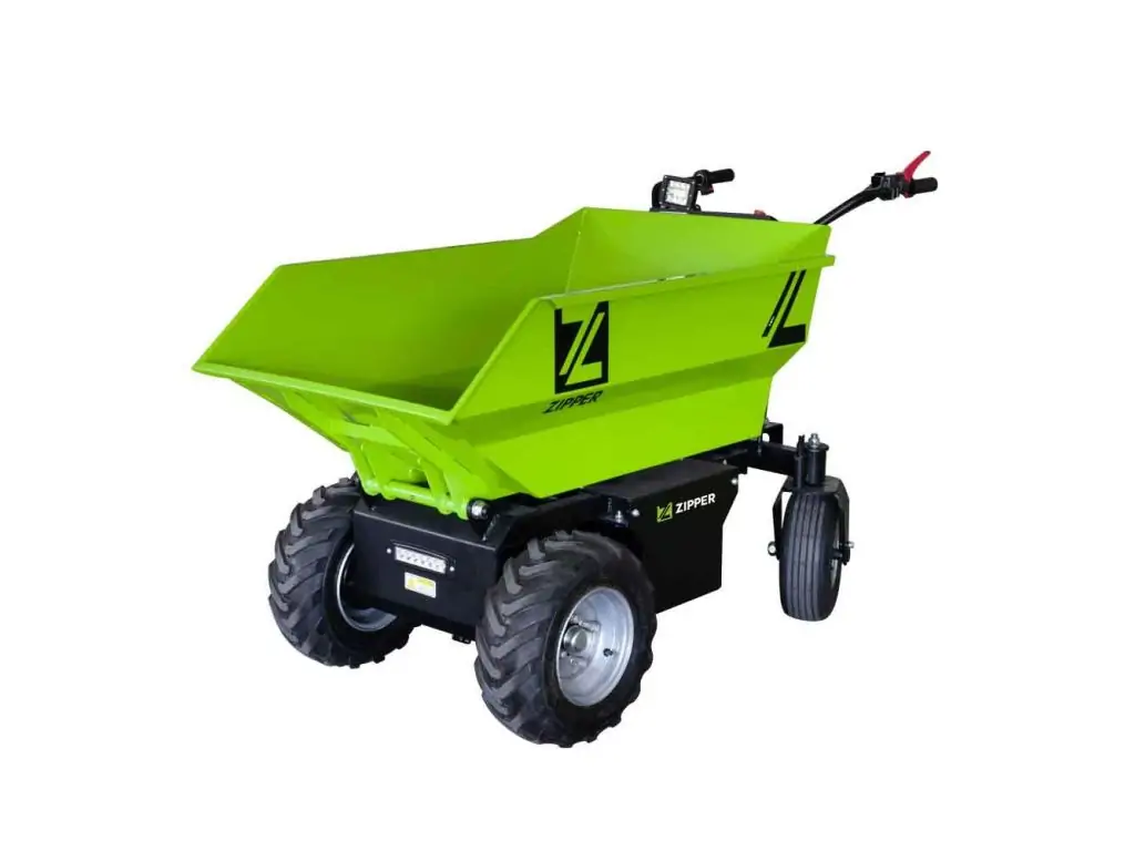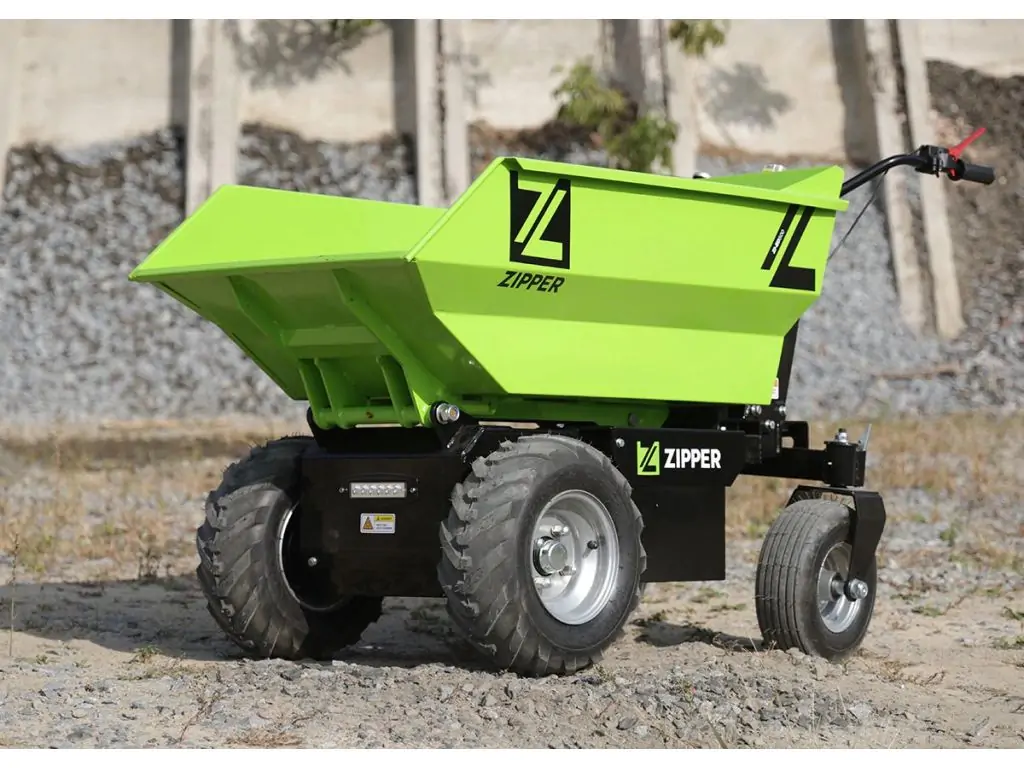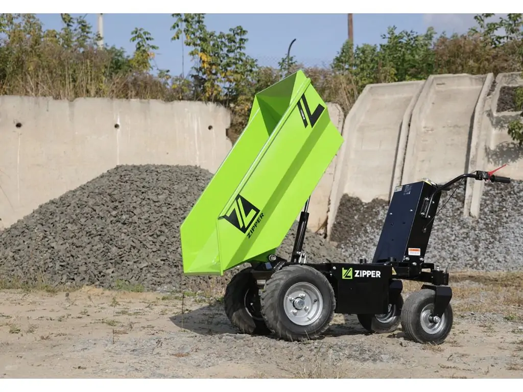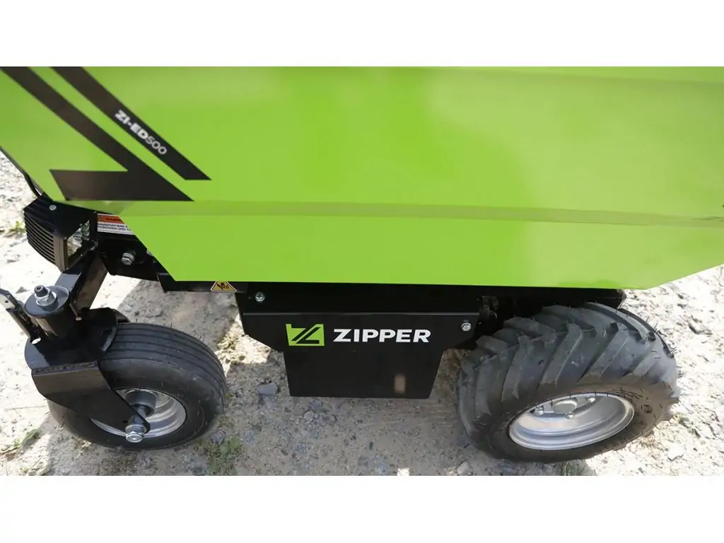 Міні самоскид Zipper ZI-ED500 призначений для перевезення на невеликі відстані піску, гравію, каменю, землі, будівельного сміття та інших сипучих матеріалів. Оснащений привідним двигуном потужністю 1000 Вт та двигуном гідравлічного нахилу і перекидання кузова потужністю 800 Вт. Свинцево-кислотний акумулятор ємністю 48 В/32 Ач забезпечує до 8 годин безперервної роботи і повністю заряджається за 7 годин.