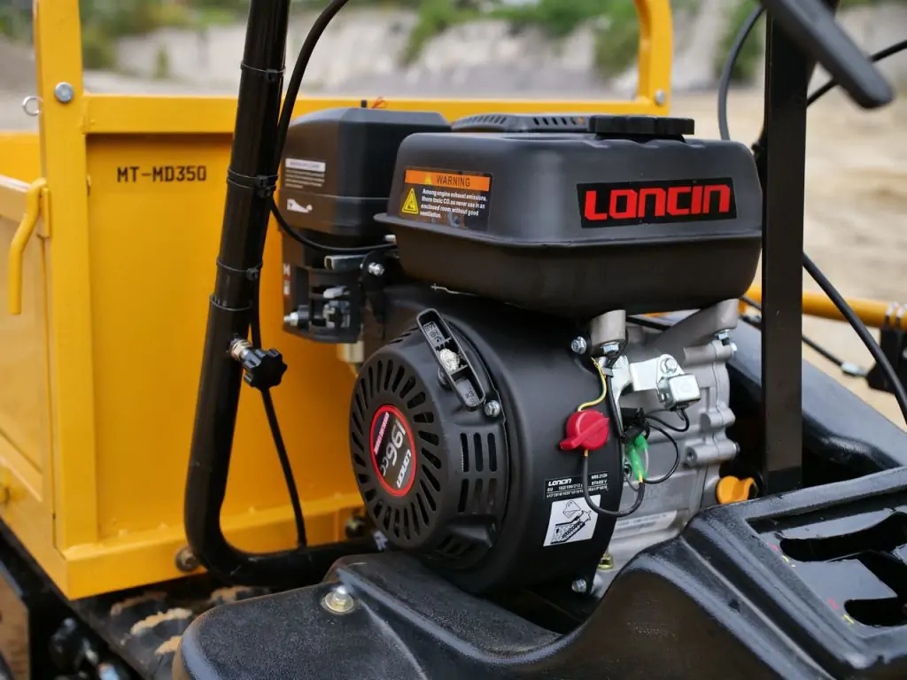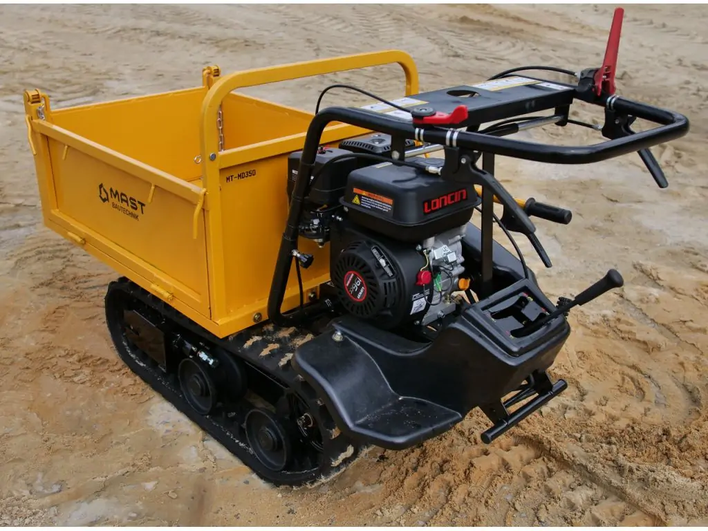 Гусеничний міні-самоскид MAST Bautechnik MT-MD350 - це зручна і надійна техніка для переміщення вантажів на невеликі відстані. Завдяки гусеничному шасі має відмінну прохідність на пересіченій місцевості і легко долає схили до 25°. Витривалий бензиновий двигун Loncin G200F потужністю 4,1 кВт забезпечує стабільну, ефективну роботу навіть у важких умовах. Ширина думпера становить 750 мм, що дозволяє легко проїжджати у вузькі проходи та по важкодоступних ділянках, а 6 передач вперед і 2 назад - зручно маневрувати в обмеженому просторі.