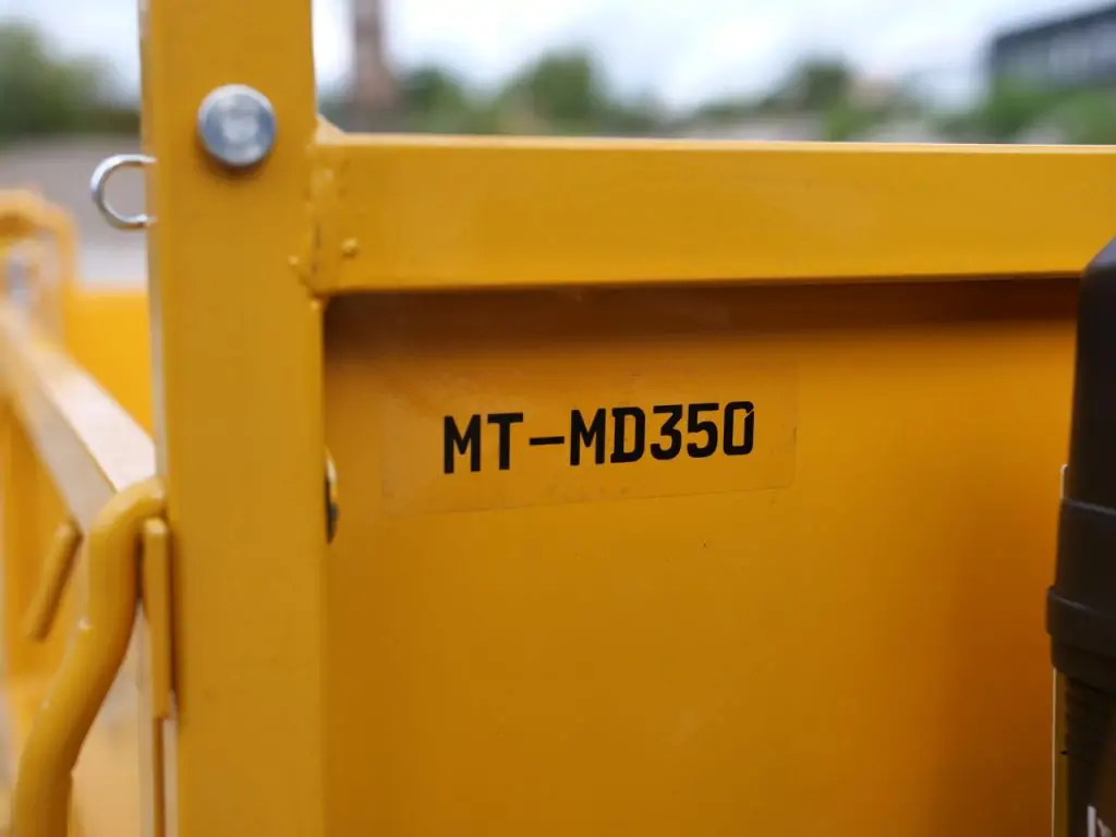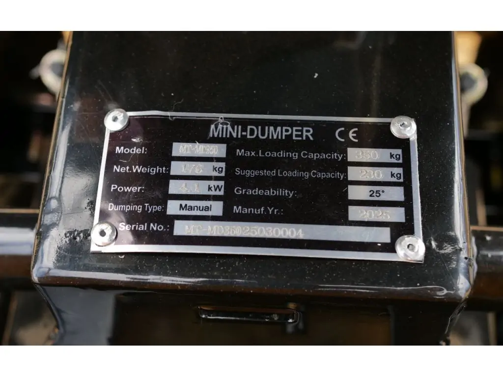 Максимальна вантажопідйомність моделі становить 350 кг. Кузов має розмір 850х570х290 мм (ДхШхВ) і виготовлений зі сталі з антикорозійним покриттям. Перекидання кузова виконується вручну. Максимальний кут нахилу кузова - 60°. Самоскид-думпер гусеничний MAST Bautechnik MT-MD350 має просте важільне управління і легкий в експлуатації.