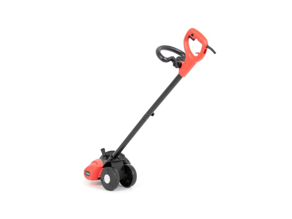 Електричний тример для країв газону з електродвигуном потужністю 1200 Вт і регульованою ручкою.
