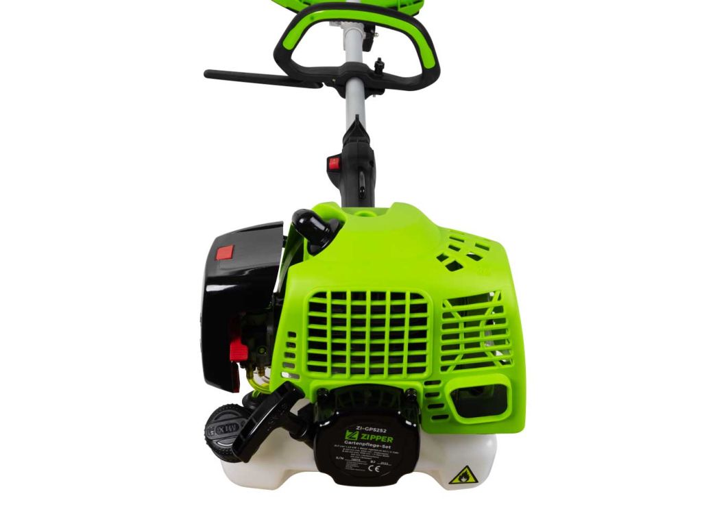 Садовий набір Zipper ZI-GPS252 - це універсальна комбісистема по догляду за садом, яка складається з 3 насадок (садові ножиці, пила і кущоріз) та приєднувальної штанги. Працює на основі 2-тактного бензинового двигуна об’ємом 51,7 куб.см і потужністю 1450 Вт. Повітряне охолодження двигуна і об’єм паливного бака 0,92 л дозволяють тривалу роботу без вимушених зупинок. Пристрій легко запускається за допомогою ручного стартера.