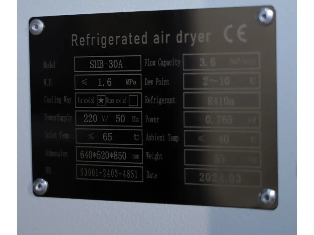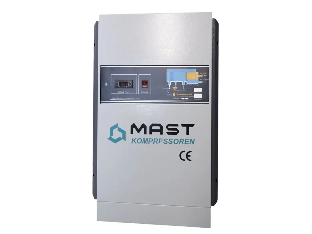 Осушувач стисненого повітря Mast SHB-30 (16 Бар) рефрижераторного типу призначений для видалення надмірної вологи і масляних вкраплень зі стисненого повітря, яке надходить від компресора. Температура точки роси становить 2℃, що є оптимальним для більшості виробничих процесів. Завдяки пропускній здатності 3600 м3/хв сумісний з більшістю промислових компресорів. Максимальний тиск 16 Бар дозволяє ефективно застосовувати цей осушувач у сферах, де використовується стиснене повітря з високим тиском. Працює від напруги 230 В.