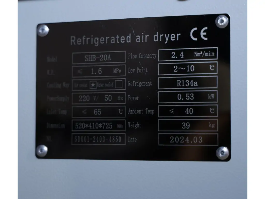 Осушувач стисненого повітря Mast SHB-20 (16 Бар) рефрижераторного типу ефективно видаляє зі стисненого повітря, яке надходить від компресора, надмірну вологу і вкраплення мастила, підвищуючи його якісні показники. Продуктивність 2400 л/хв і точка роси 2℃ дозволяють використовувати його з більшістю промислових компресорів практично у всіх виробничих процесах. Завдяки максимальному тиску 16 Бар цей осушувач може успішно застосовуватися на підприємствах, що працюють зі стисненим повітрям під високим тиском. Живлення від напруги 230 В.