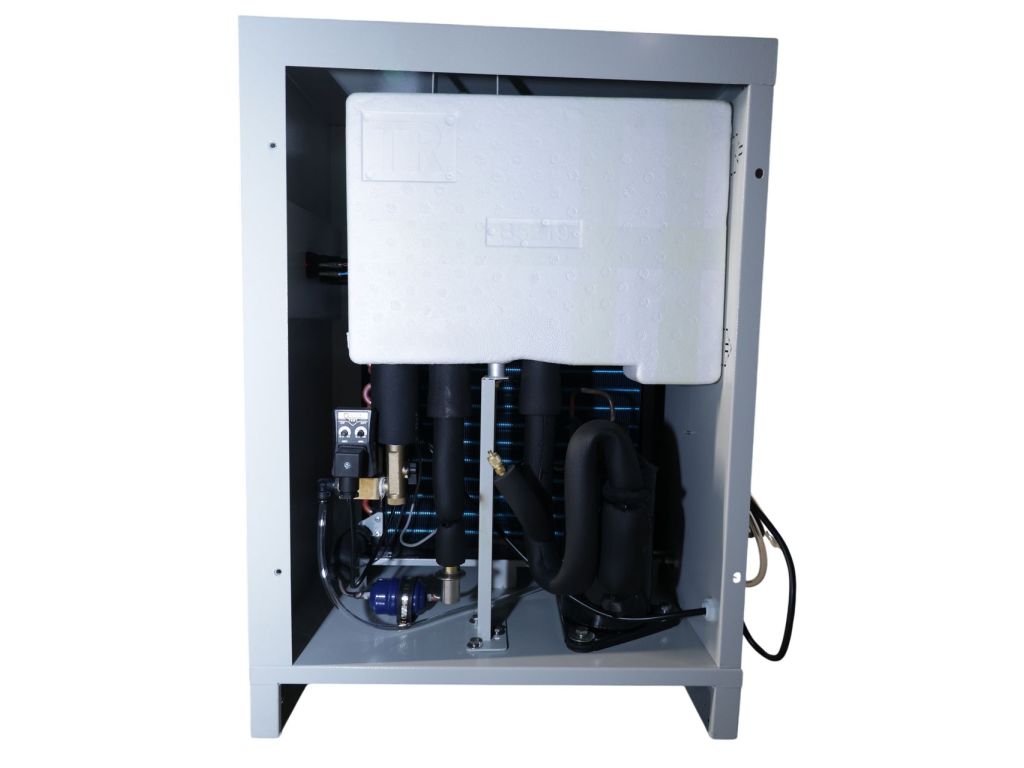 В основі роботи осушувача рефрижераторного типу - охолодження стисненого повітря до температури, нижчої за точку конденсації вологи. Після цього конденсат видаляється через дренажну систему, а стиснене повітря нагрівається до кімнатної температури і подається на вихід.