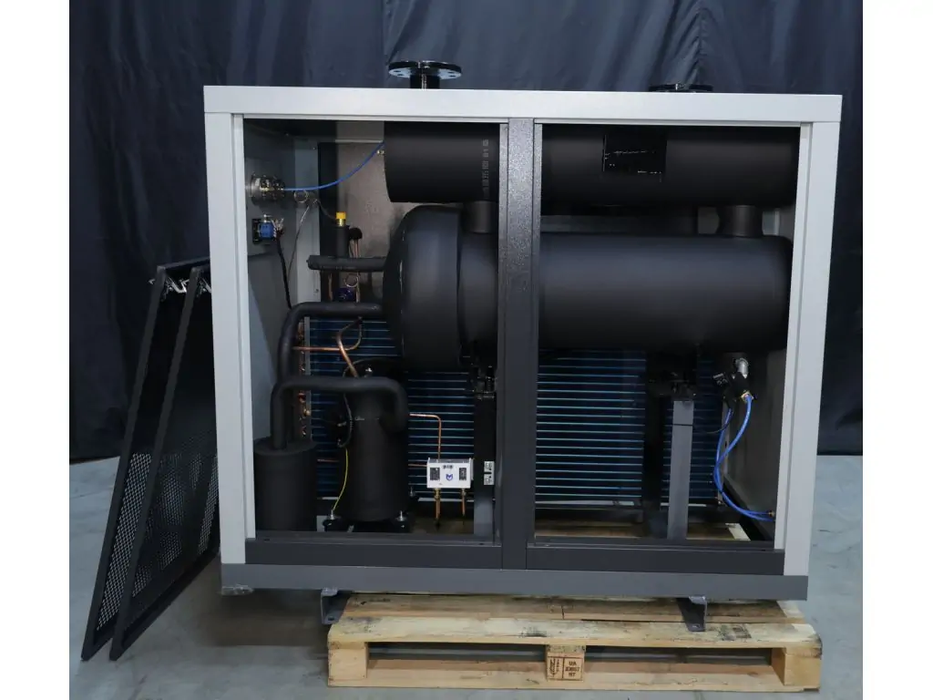 Рефрижераторний осушувач охолоджує стиснене повітря до певної температури, при якій волога конденсується та відводиться через дренажну систему. Потім охолоджене повітря знову нагрівається до кімнатної температури і подається на вихід.