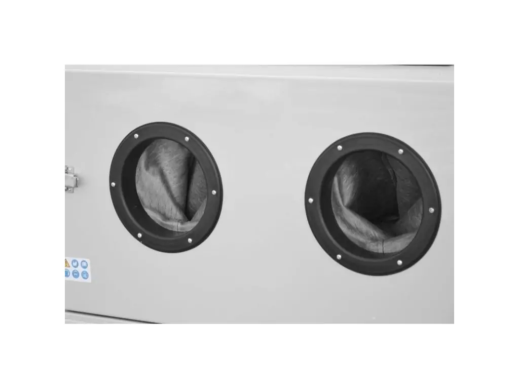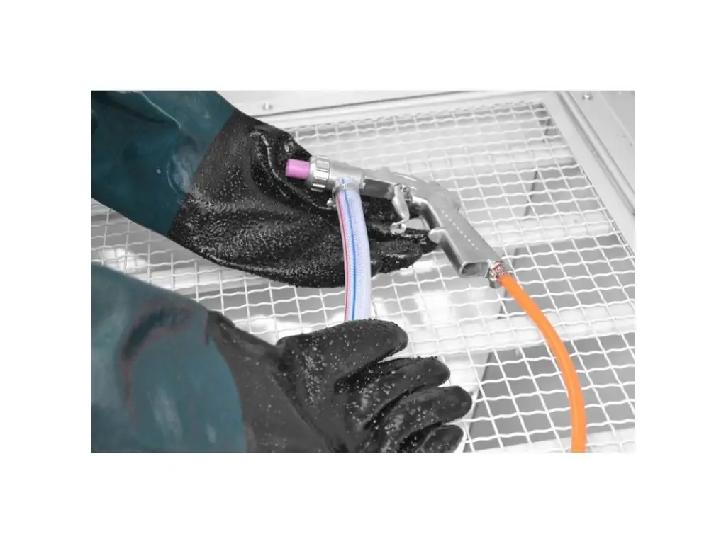 Об’єм камери 330 л і бокове завантаження дозволяють зручно обробляти довгі та громіздкі заготовки. Робочий тиск 2,76 - 5,52 Бар забезпечує оптимальну для якісного очищення силу потоку. Пістолет з 4 змінними форсунками дає змогу коригувати силу і напрямок абразивного потоку. Піскоструминний шланг розміщений у нижній частині. Збільшене оглядове вікно надає відмінний огляд робочої зони, а великий дренажний отвір дозволяє легко замінити абразив. Камера оснащена периферійними гумовими ущільнювачами, системою відводу пилу і фільтром, який ефективно вловлює і утримує частинки пилу. На нашому сайті ви можете купити цю та інші високоякісні піскоструминні камери в Україні з доставкою та гарантією 12 місяців.