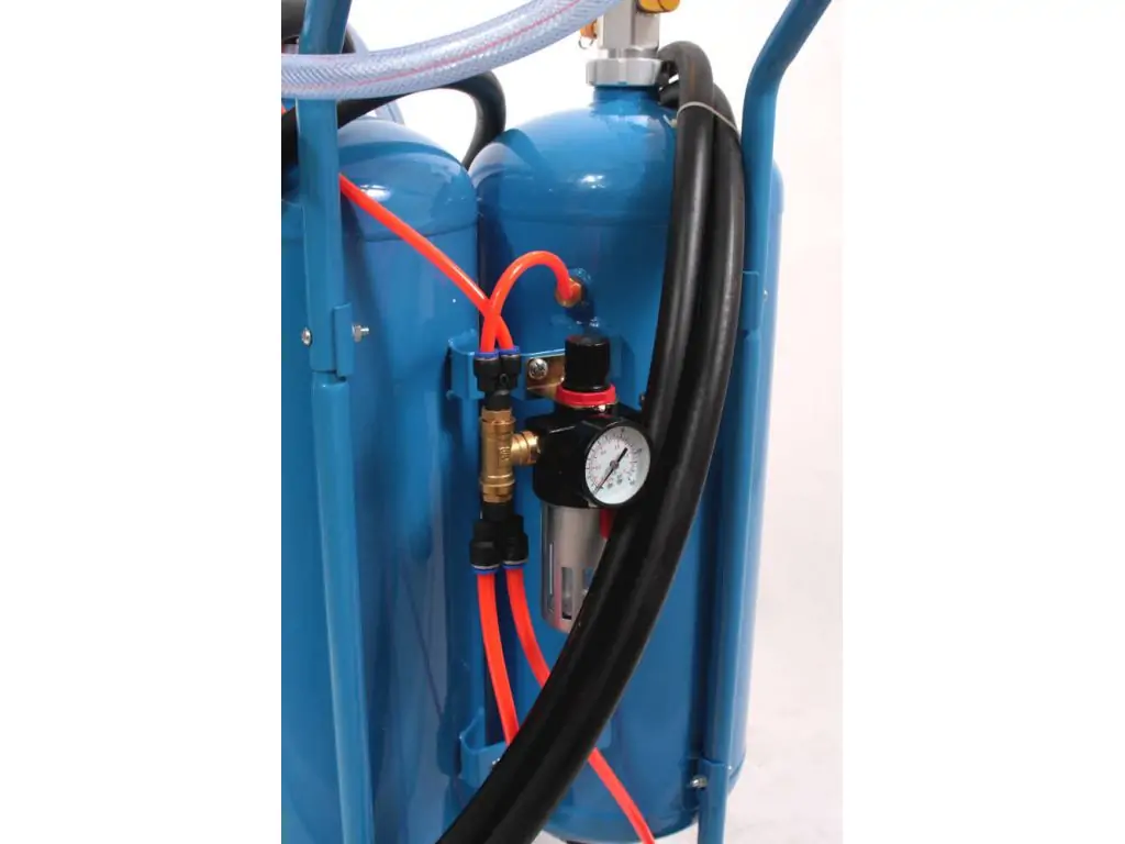 Апарат має 2 окремих баки об’ємом 25 л для кожного виду очищення. Перемикання режимів швидке і легке за допомогою розміщених на пістолеті клапанів. Витрата повітря - 400-800 л/хв, робочий тиск - 6-8 Бар. Міцна сталева конструкція зі стійкою підставкою, 2 колесами і ручкою для переміщення зручна у використанні і довговічна, завдяки чому цей універсальний піскоструй надійно служитиме тривалий час.