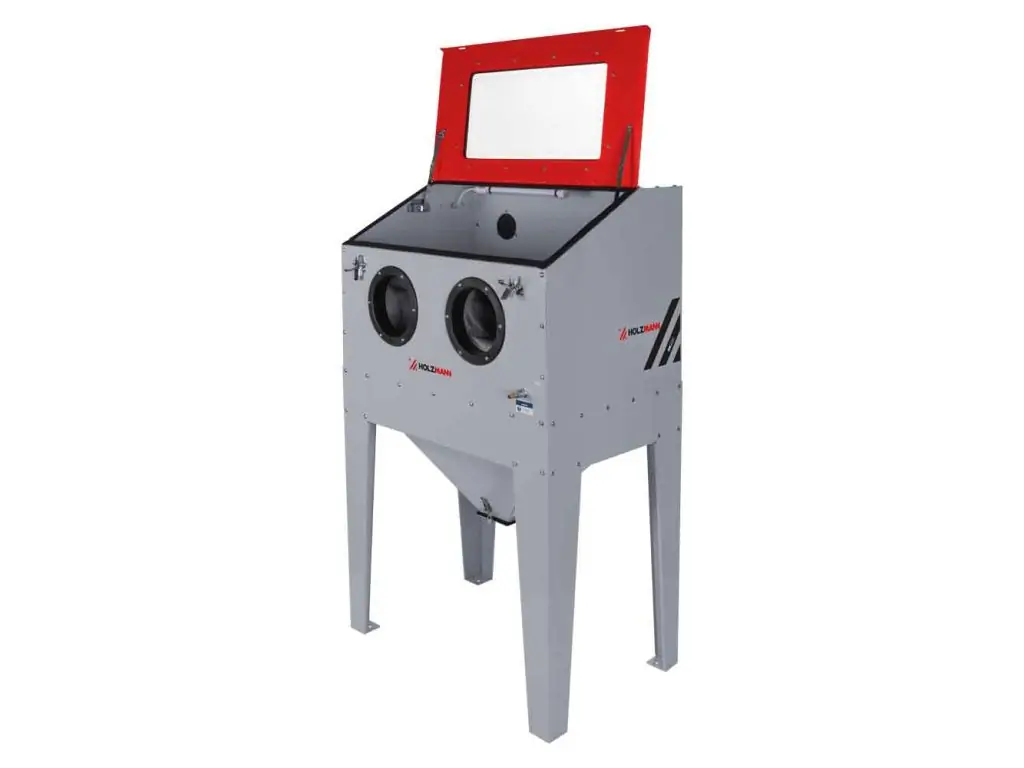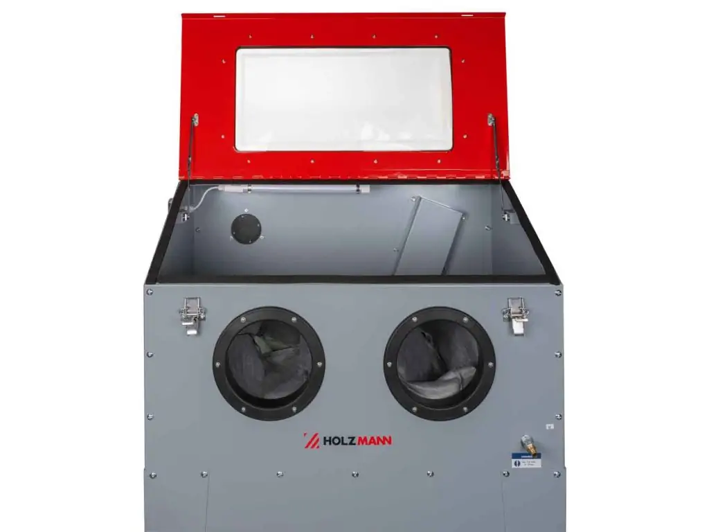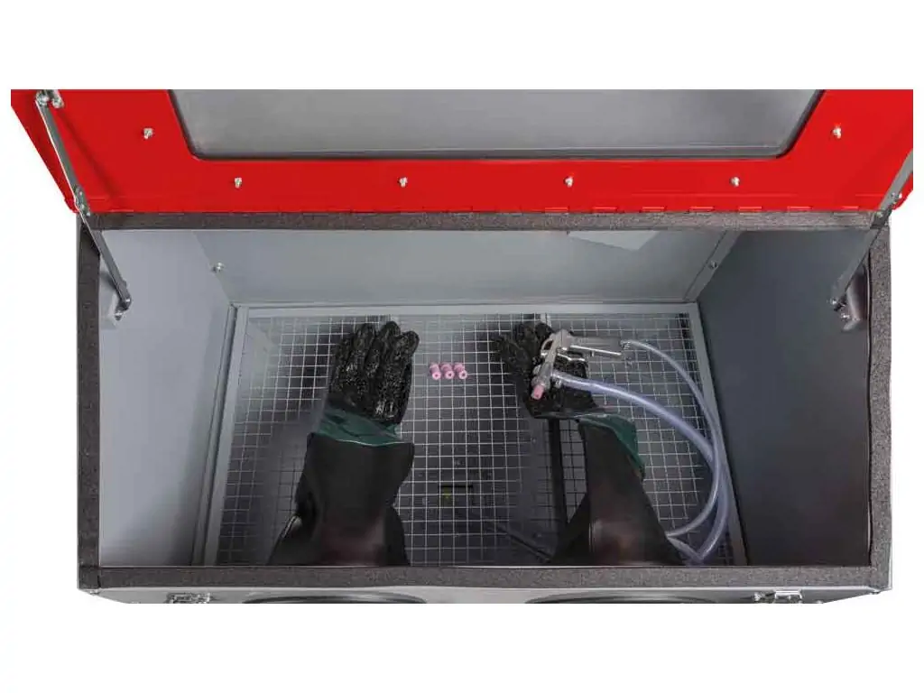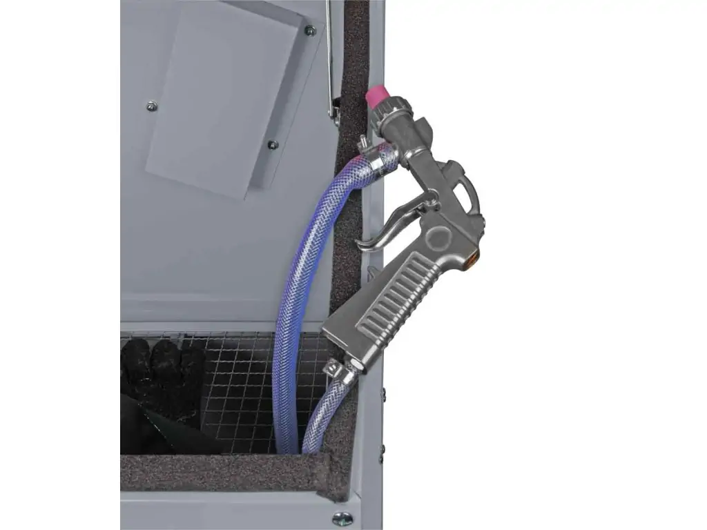 В стандартну комплектацію входить піскоструминний пістолет з 4 змінними насадками, яка мають сопла 4, 5, 6, 7. Завдяки цьому можна регулювати напрямок і силу абразиву. Велике оглядове вікно і LED-освітлення робочої зони забезпечують надійний контроль процесу обробки. Ця камера піскоструйне очищення виконує з високою якістю та ефективністю і є відмінним варіантом для майстерень з обмеженим робочим простором.