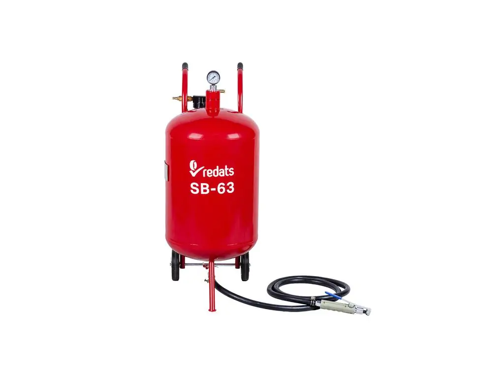 Піскоструминний апарат 63 л REDATS SB-63 - це професійне обладнання напірного типу для очищення поверхонь струменем абразиву під тиском. Ефективно знімає бруд, іржу, окалину, стару фарбу і лак та інші забруднення з металу, каменю, бетону, цегли і подібних матеріалів. Із застосуванням низького тиску та легких абразивів може використовуватися для безпечного очищення делікатних поверхонь і матування скла.