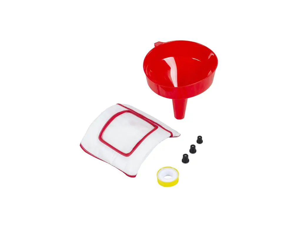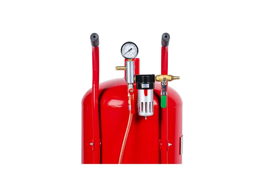 Об’єм бака 63 л достатній для робіт середньої та високої інтенсивності, де потрібні висока продуктивність і тривалі цикли без частих дозаправок. Завдяки вертикальній формі бака з конусним дном абразив самопливом надходить до вихідного клапана, що гарантує стабільну подачу до повного спорожнення. Комплект сопел різного діаметра (2 мм, 2,5 мм, 3 мм, 3,5 мм) дозволяє налаштувати апарат під тип абразиву та матеріалу і регулювати інтенсивність струменя. Для максимальної ефективності роботи цей напірний піскоструминний апарат 63 л оснащений блоком підготовки повітря з манометром, клапанами для регулювання потоку повітря і кількості абразиву та ергономічним пістолетом з швидкодіючим курком зупинки подачі. Колеса і ручка дозволяють легко переміщати пристрій по робочій зоні.