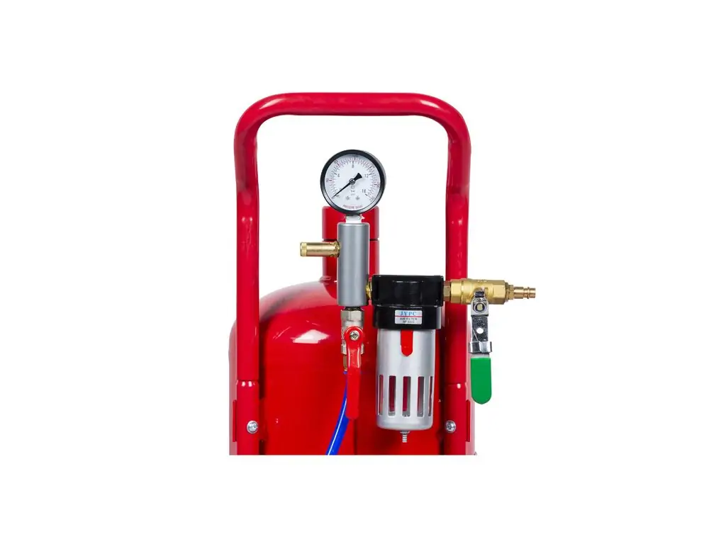 Апарат витримує тиск до 8,6 Бар і сумісний з широким спектром абразивів. Для зчитування поточного тиску є манометр. Об’єм бака 17 л оптимальний для середніх обсягів робіт зі збереженням мобільності. Бак виготовлений із товстостінної сталі з якісними зварними швами і герметичною горловиною. Колеса і ручка дозволяють переміщати пристрій, не піднімаючи його із землі. Такий піскоструй на колесах поставляється з комплектом сопел різних діаметрів (2 мм; 2,5 мм; 3; 3,5 мм), що дає змогу адаптуватися під тип абразиву і поверхні та налаштувати інтенсивність струменя.